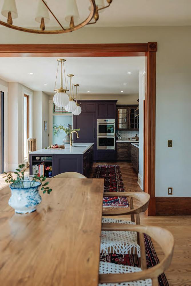 The reimagined kitchen now anchors the main floor, glowing with daylight and layered in curated detailâfrom deep plum cabinetry and unlacquered brass fixtures to a herringbone oak floor that bridges old and new. â[The ownersâ ] initial vision was almost like a conservatory off the back of an old English homeâglassfilled and light-filled,â says Harlow.