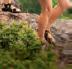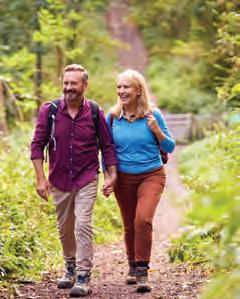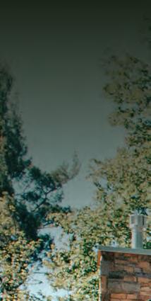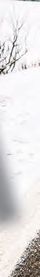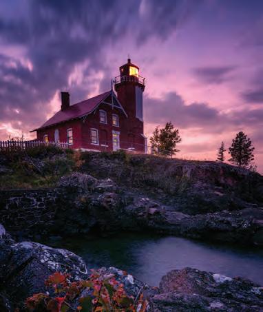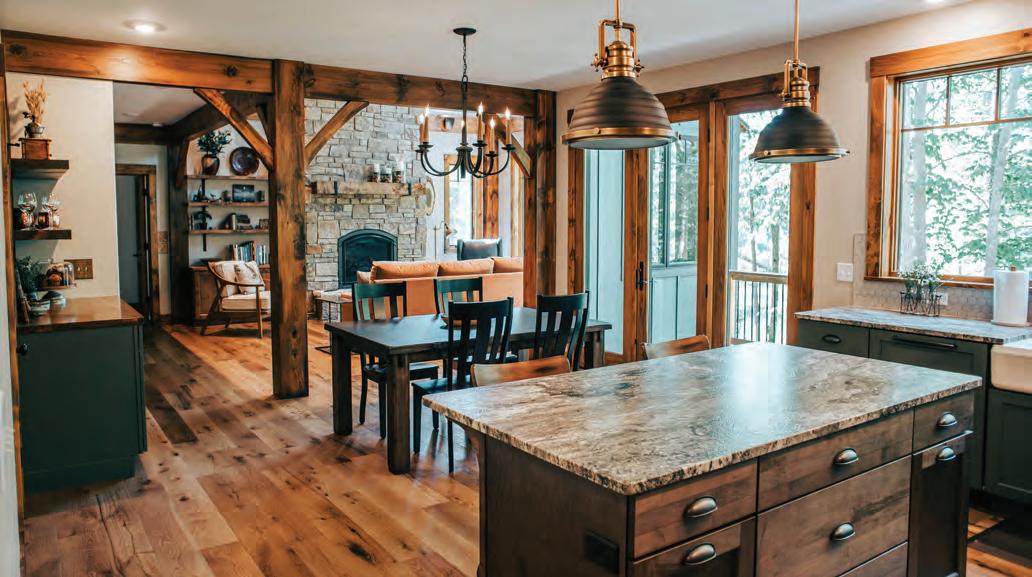 Designed by Scott’s son, Caleb Norris, the home uses earth-tone colors, woodwork and natural products to harmonize with its environment. That begins with the site, where the stone foundation, cedar shake siding and sage-colored board-andbatten exterior blend with the forest setting. The home’s structural white pine timbers, harvested from the site and its surrounding forest, were shaped in Norris’s own timber-frame shop. Those sturdy beams are complemented by rustic interior elements, like the stone fireplace that soars to the pine-clad cathedral ceiling.