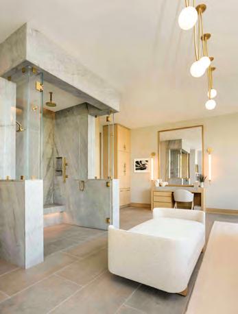 Downstairs, lighter tones signal a serene, spa-style retreat featuring a steam room, soaking tub and workout area—“a complete departure from upstairs,” says Murdock. “In the end, they can do everything you’d want to do at a hotel, right here at home.”