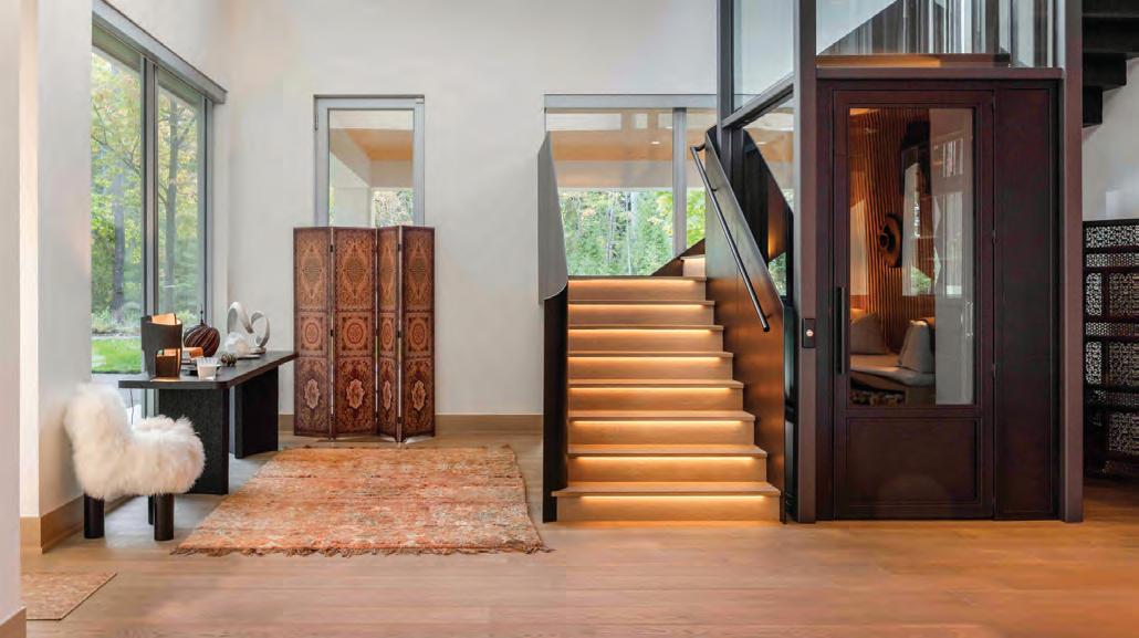 “Fred brought us the project…it’s a one‑of‑a‑kind piece of art, and always a challenge as the builder,” says Miller, mPn’s co owner and general manager. The showpiece of those challenges? A two story, fully exposed glass elevator—sleek, dramatic and anything but standard. “It took countless on site meetings to figure out the structural and code issues,” Miller adds. “There was no playbook.” The result is a stunning vertical sculpture of glass and artisan crafted metal that feels more like a museum installation than a utility.