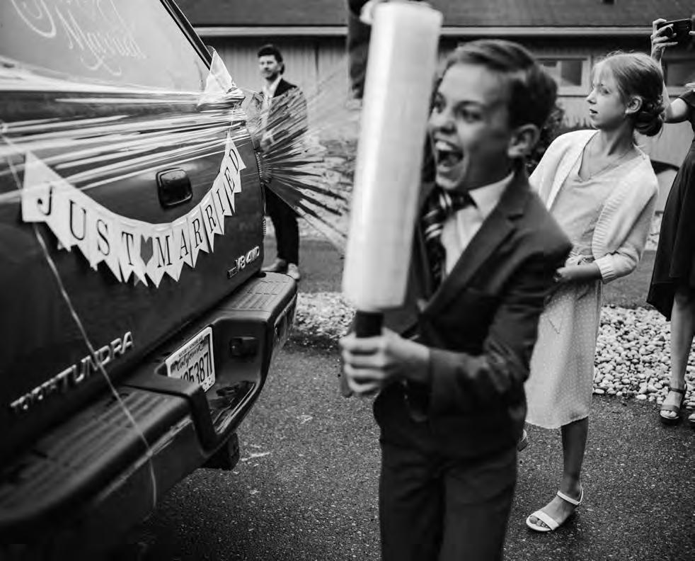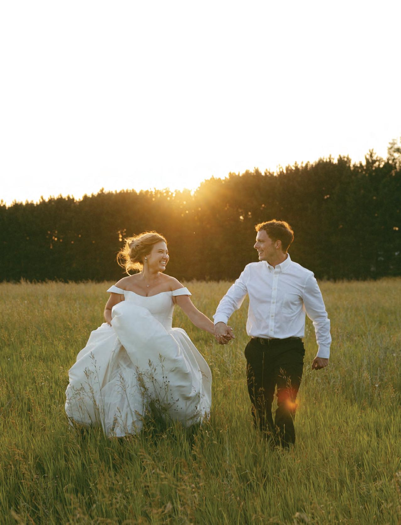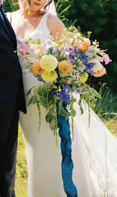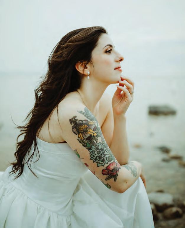 Apatch of afternoon light reflects through tulle, two lovers’ hands hover over gold bands in anticipation, glimmering leafshaped earrings brush against auburn hair. Jessie Zevalkink’s wedding photographs capture these fleeting intersections—where emotion meets memory. Her lens finds the ephemera: the afterglow of a laugh, the blur of a passing glance, the quietness that emerges. Amid the flurry of a wedding day, she spots what others might miss and whispers to the viewer, hey, look over there.