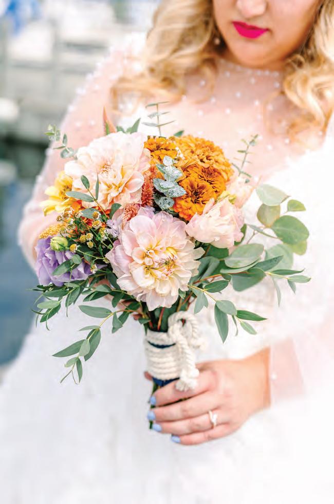 “Stephanie really drove the day,” Cassandra says. “The captain even moved the schooner into the best light for her.” W ith an eye to capturing every aspect, her friend kept the couple on schedule and directed guests where they needed to go. “Stephanie also wore blue to match our colors, as I would have chosen to have her and my sister standing next to me,” Cassandra explains.
