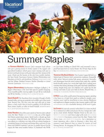 Summer Staples Farmers Markets: Traverse City’s emergent food culture isn’t just a passing trend; it’s firmly rooted in the region’s rich agricultural tradition, which grows more exciting each year as farmers and food artisans with great ideas put their stamp on the scene. Check out the bounty at the city’s two weekly markets: the Sara Hardy Downtown Farmers Market (Wednesdays and Saturdays at Cass St. and Grandview Parkway; DOWNTOWNTC.COM) and the Village Outdoor Farmers Market (Mondays at Grand Traverse Commons; THEVILLAGETC.COM).