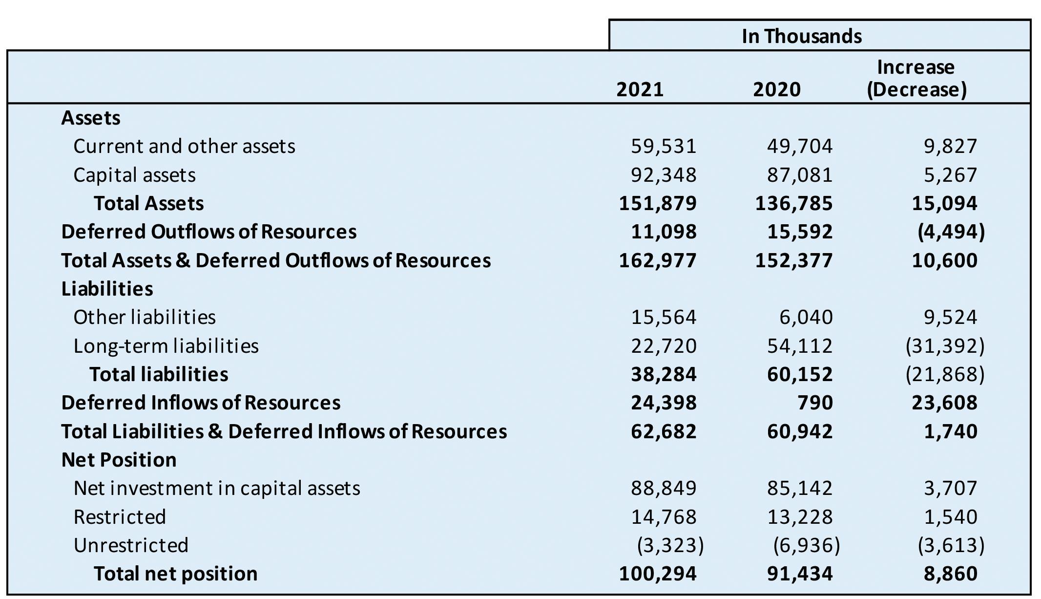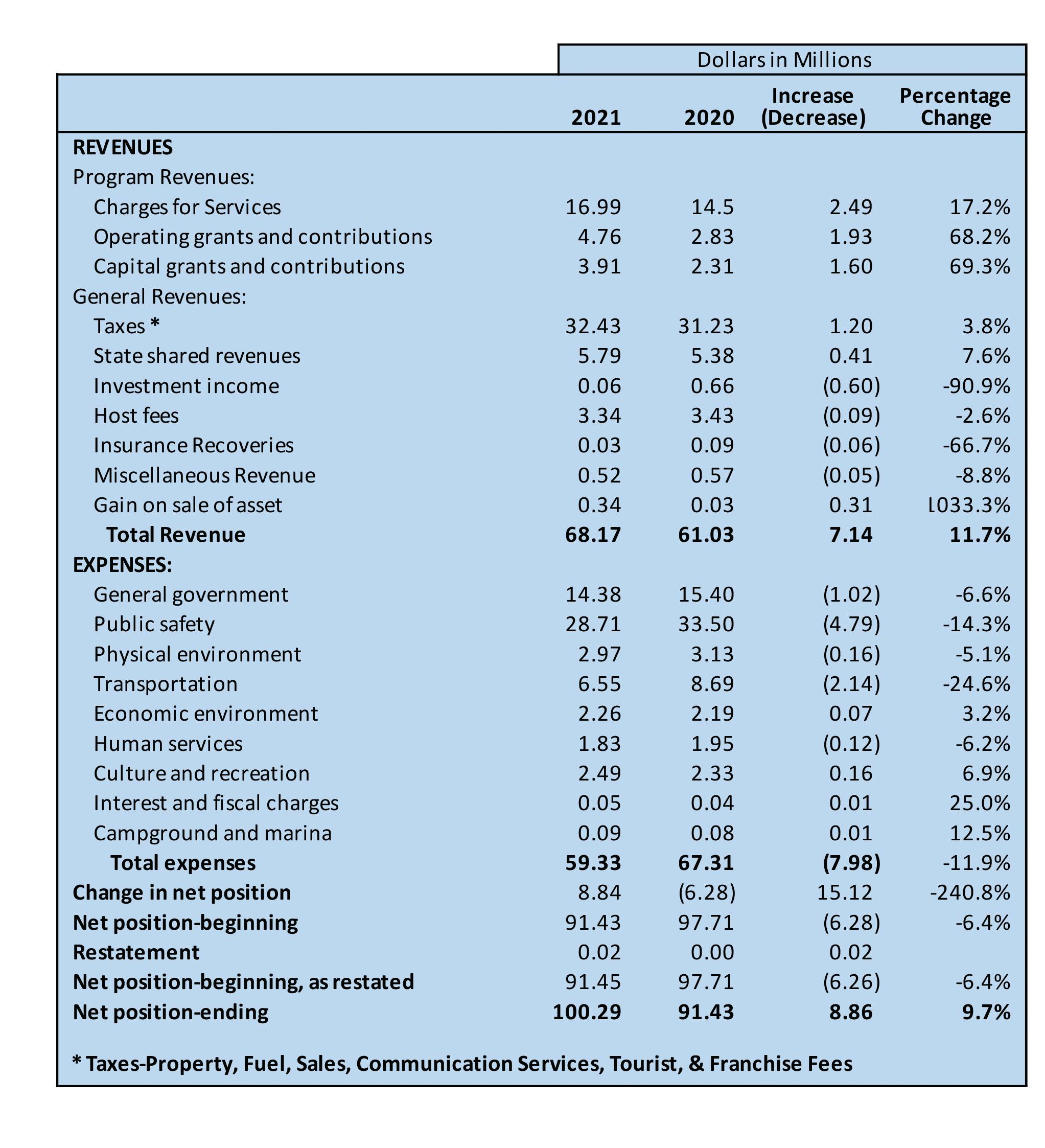 Okeechobee County Statement of Net Position provides information on county-wide assets, liabilities, and deferred inflows/outflows of resources with the difference reported as net position.The County’s financial position is reflected in the Statement of Net Position below showing the change from fiscal year 2020 to 2021. An increase in net position from one year to the next would indicate improvement and a decrease would indicate deterioration.