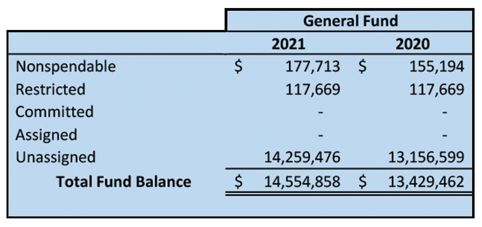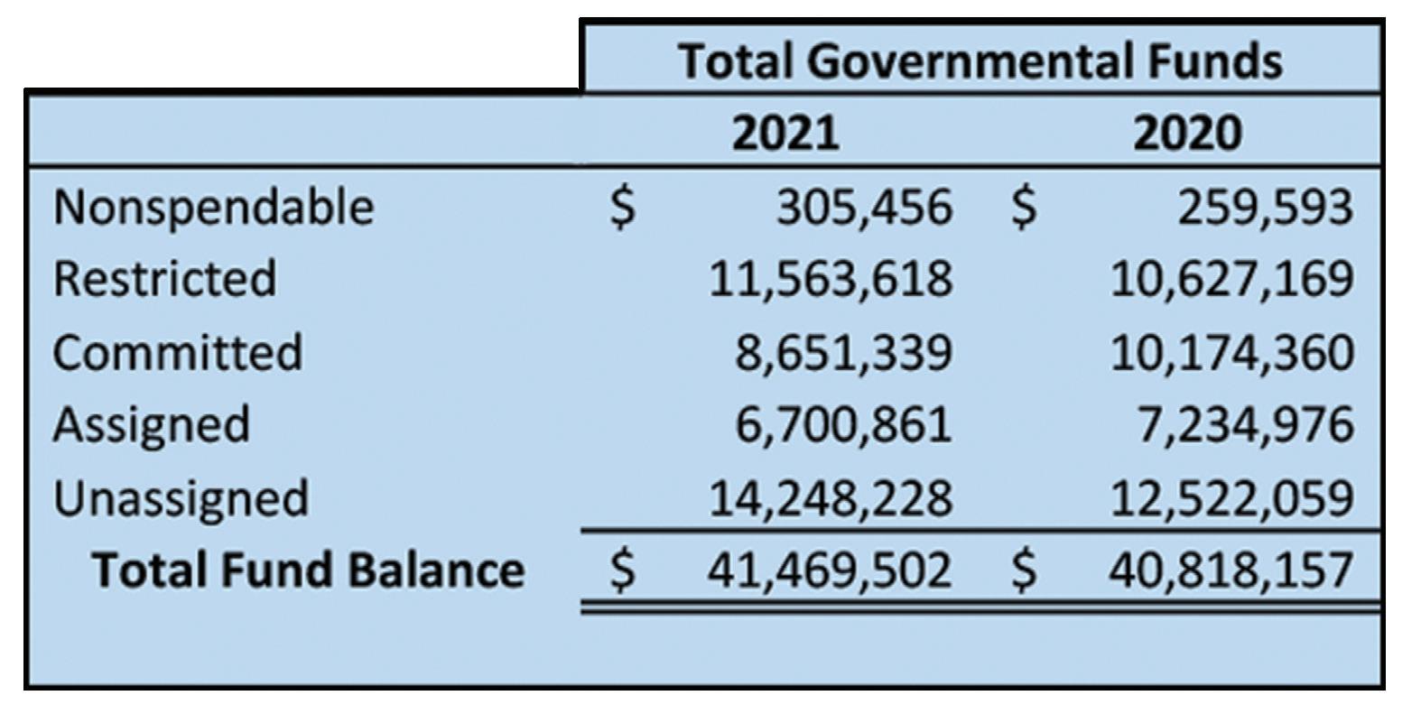 Okeechobee County’s General Fund is the chief operating fund and it accounts for all government operations not reported in other funds.The County’s General Fund balance was $14.6 million while the combined Governmental Funds totaled $41.5 million as of September 30, 2021. These two balances reflected a $1.1 million and $0.6 million increase respectively from the prior fiscal year. The $41.5 million is a combination of $0.3 million of nonspendable funds, $11.6 million of restricted funds, $8.7 million of committed funds, $6.7 million of assigned funds, and $14.2 million of unassigned funds that is available for use by the County.