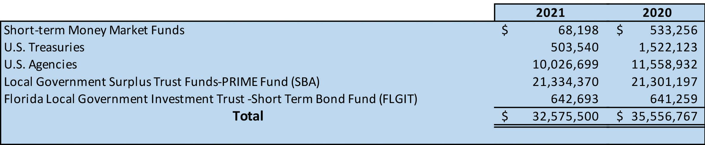 The County’s cash/cash equivalent and investments for all governmental funds total $52.2 million as of September 30, 2021. In accordance with Florida Statutes section 218.415, the Clerk manages the County’s investment portfolio with the objective of preserving capital and maintaining enough liquidity to meet anticipated cash flow when needed. Additionally, the purpose of investments is to maximize earnings within statutory and fiduciary constraints.