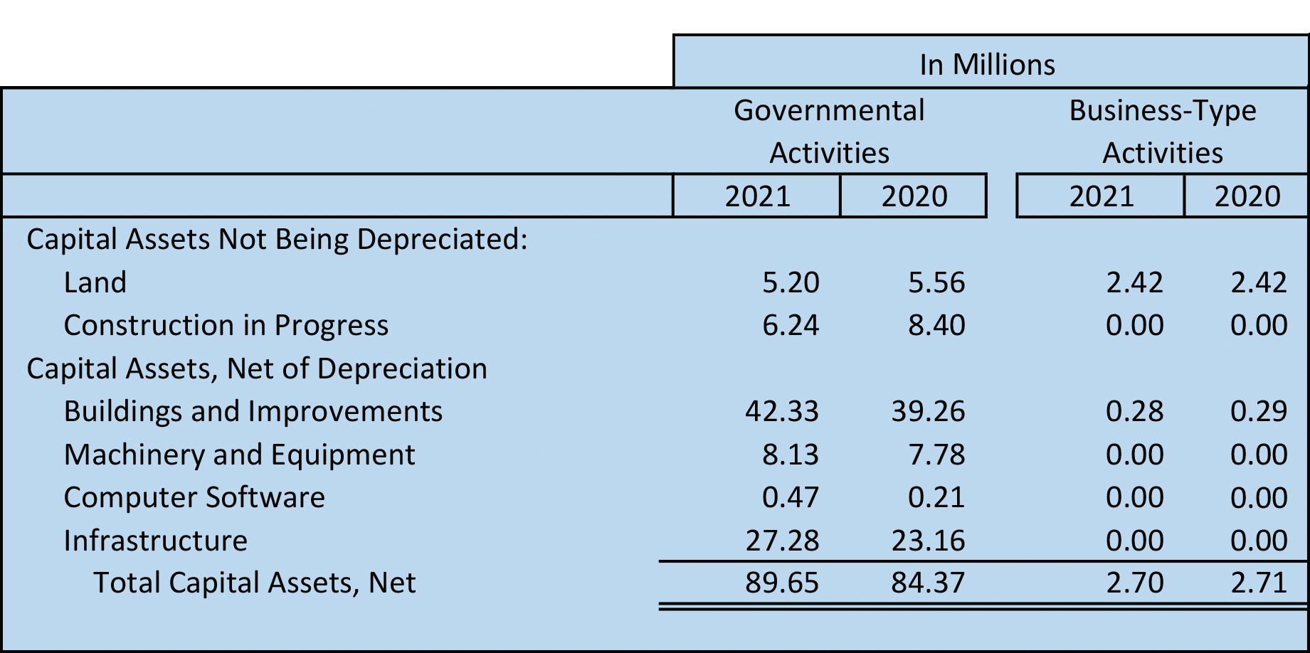Capital assets are resources with initial useful lives that extend beyond one reporting period. Equipment, land, land improvements, buildings, building improvements, vehicles, machinery, and infrastructure are some examples of the County’s capital assets. Capital assets of a government are not current financial resources; they are recorded as assets in the government-wide financial statements. Okeechobee County’s investment in capital assets for its governmental and business-type activities net of depreciation as of September 30, 2021 amounted to $89.6 million and $2.7 million respectively.