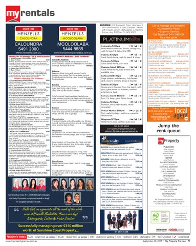 Let us manage your property s #OMPETITIVE 2ATES s 3UPERIOR 3ERVICE Call Stuart on 0414 349 424 for a free quote 30 KOALA COURT, LITTLE MOUNTAIN $480 pw HOUSE 4 bed, 2 bath, 2 car, 2 living areas, fireplace & ceiling fans, outdoor living, huge yard, fully fenced, pets on application. 82/1 MILLENNIUM CIRCUIT, PELICAN WATERS $425 p/w UNIT 3 bed, 2 bath, 2 car, 3 balconies, resort living, swimming pools, tennis courts, golf course. 20 ROSLIN ST, MOFFAT BEACH $400 p/w HOUSE Fully furnished, 3 bed, 1 bath, 1 car, fully fenced, pet friendly, sort after area. 7 GIPPS ST, CALOUNDRA WEST $390 p/w HOUSE 4 bed, 2 bath, 2 car, air-con, fully fenced, close to shops, park and schools, pets on application.