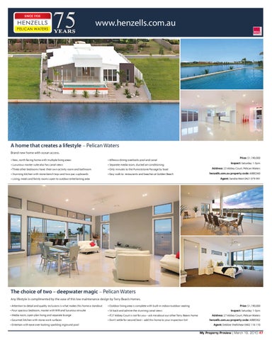 Price: Inspect: 4BUVSEBZ QN Address: "CCFZ $PVSU 1FMJDBO 8BUFST henzells.com.au property code: "##& Agent: %FCCJF 4IFMMTIFBS My Property Preview | March 19, 2010 47