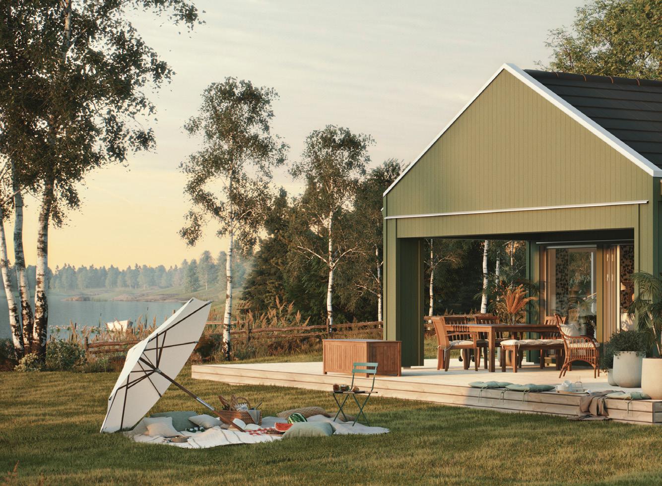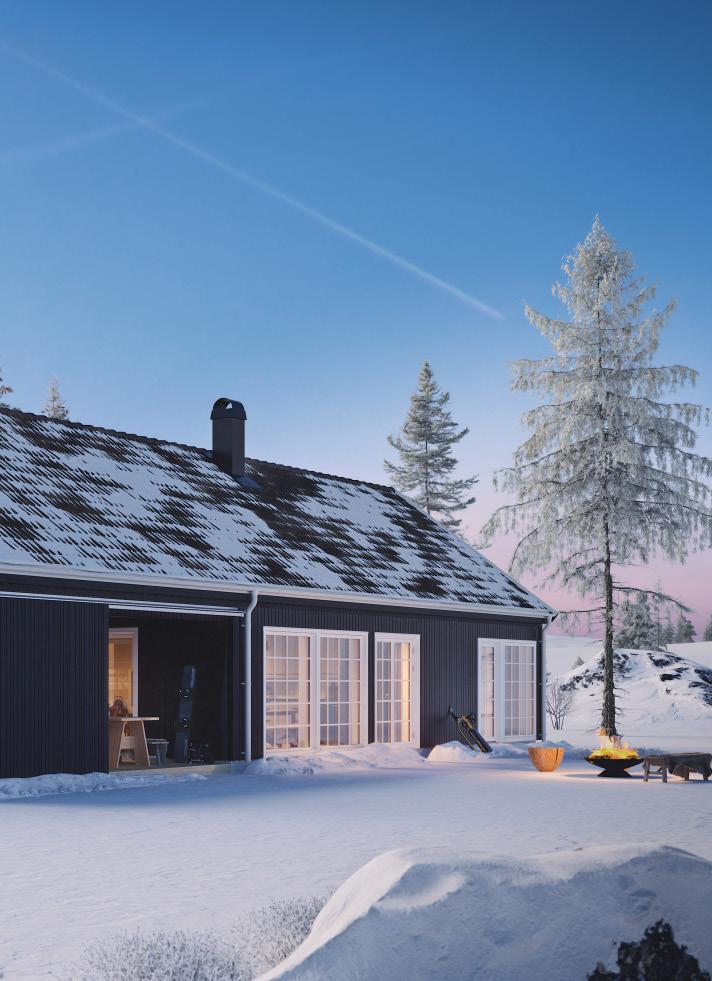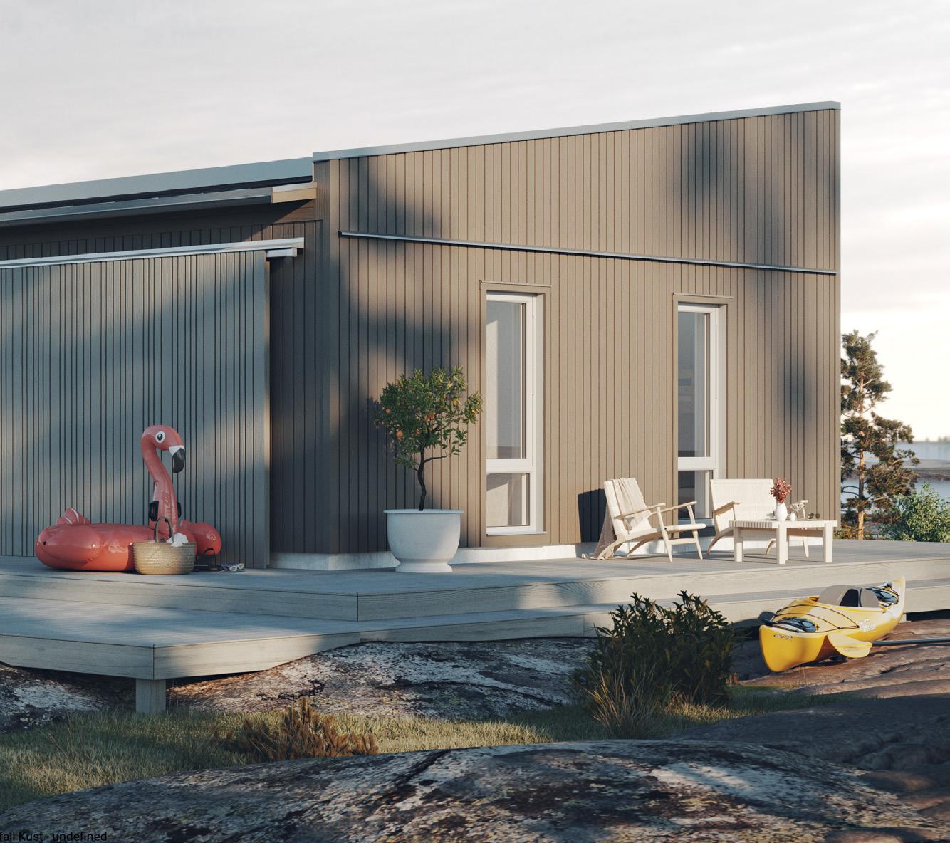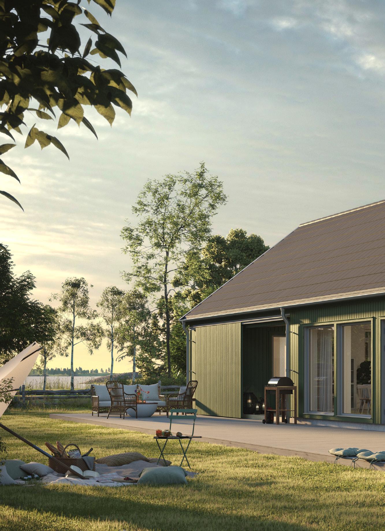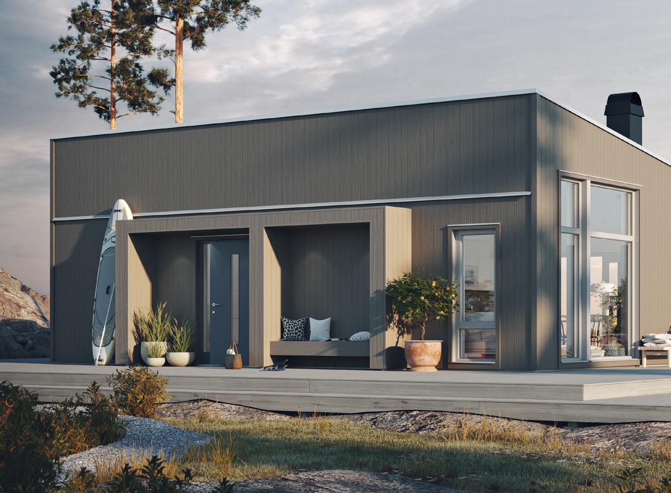 – Brant sadeltak – Integrerad sittbänk – Stora fönsterpartier