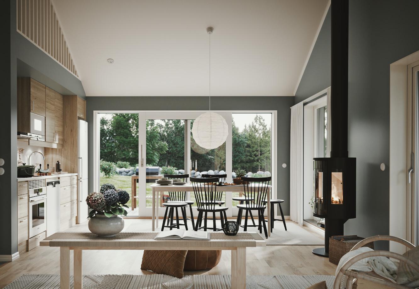Huset är uppdelat i två zoner, där entrén har en central del. I den första zonen finns sovrummen och badrummet. I den andra finns den gemsamma ytan med kök och vardagsrum – där du har möjligheten att öppna upp i nock med ett åstak. Det skapar en härlig rymd och ett fantastiskt ljusflöde. Du kan även addera till ett hajomparti vid matplatsen för att kunna binda samman köket med utsidan.