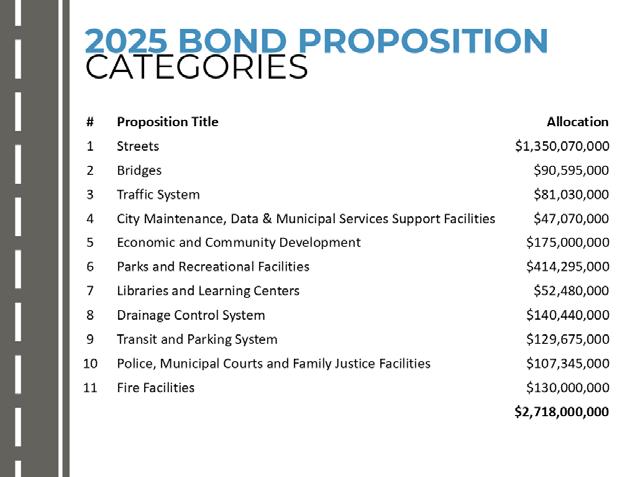 Bond projects on the ballot in 2025 were determined by resident survey results, street and bridge ratings, planning studies, the City Council’s strategic priorities, and operating impact. The 2025 package includes $2.7 billion to fund 11 fundamental categories of projects like building or repaving streets, bridges, traffic control, sidewalks, and more.