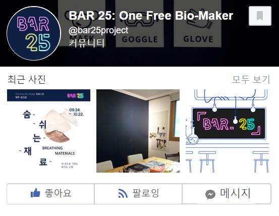 BAR 25는 바이오 신소재 개발, 미생물의 관찰과 배양을 위한 실험실 제작, 환경 문제를 탐 구하고 아이디어를 만들어나가는 창작 활동을 진행하고 있습니다. BAR 25는 다양한 분야와 전문가들 와의 교류를 통해 바이오-메이커스 분야의 저변을 넓히고 아이디어를 실천하면서 새로운 문화를 만들 어가려 합니다.