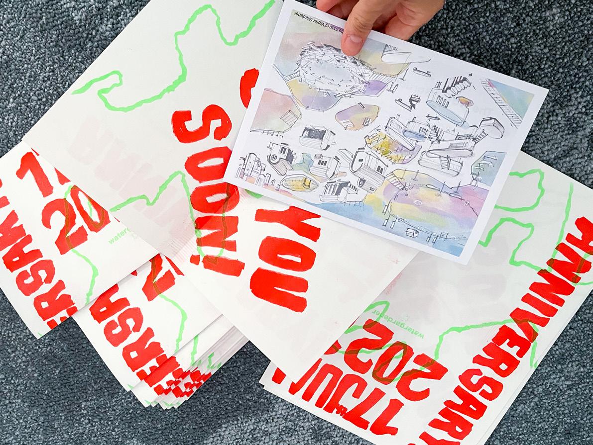 We created an invitation and poster to promote the event and invite people to attend. The backside of the invitation was designed to function as a poster itself. Between the pages, we included a postcard that people could send us to share their interest in the ‘Water Gardener’ project in the future. The backside of the postcard featured a hand-drawn map.