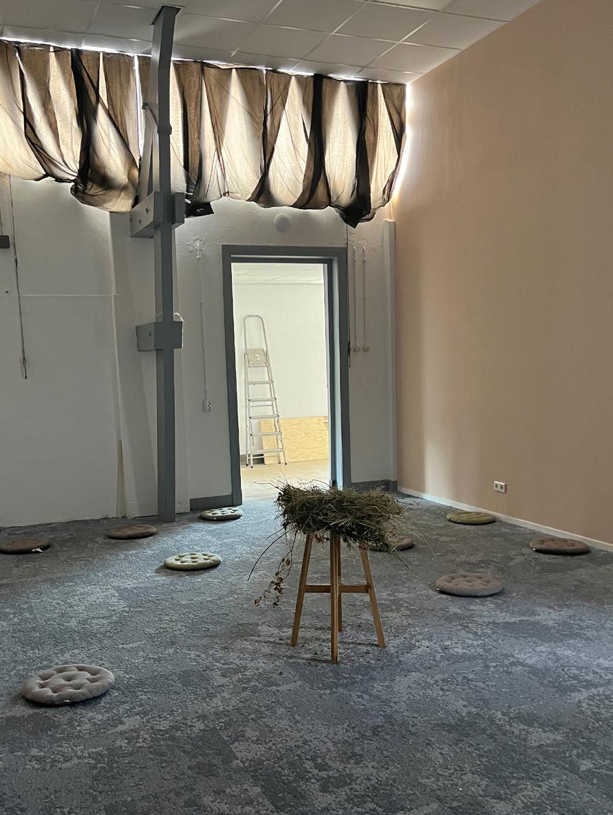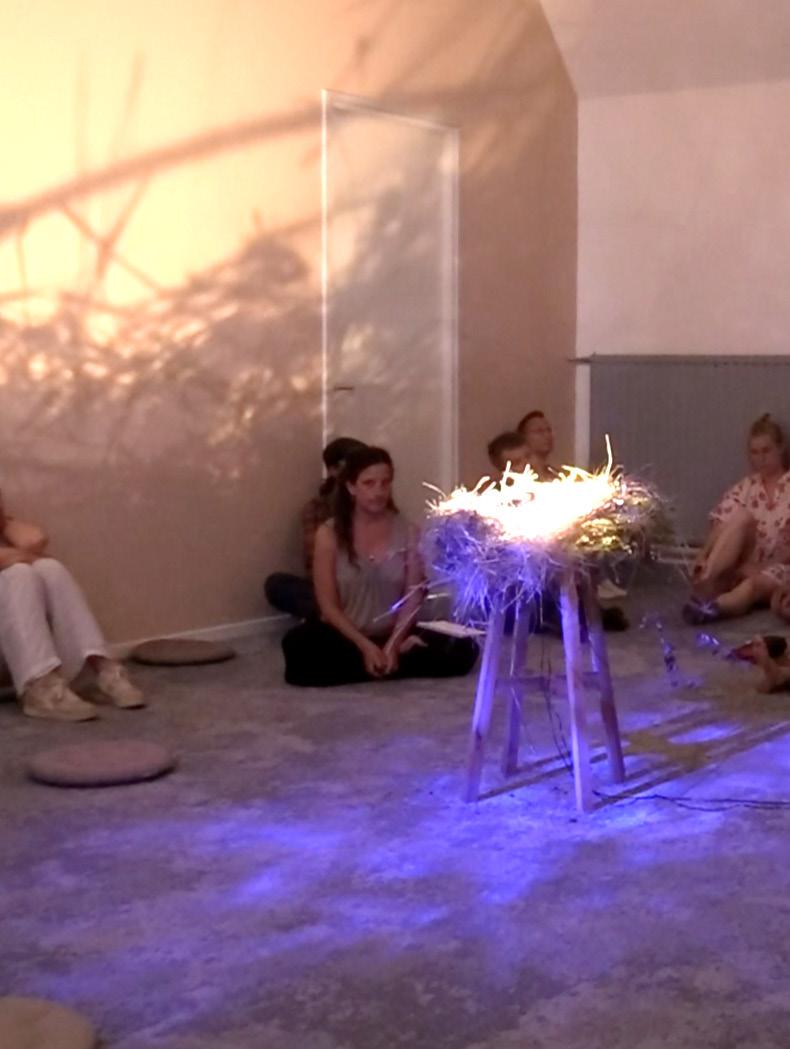 The performance was carried out on an imaginative stage that inspired the audience to feel like they were in a real conference. Based on the main motif of the ‘Floating Nest,’ we decided to make it the architectural concept for designing the space. We collected dry grass and branches to create a nest and placed several flashlights in the middle to create a 360-degree light effect. The light and nest created beautiful shadows on the walls of the room, which was blocked from outside light. As a result, the room became an immersive space. After completing the preparation with light and sound, the room had an almost ritual atmosphere, which was enough to immerse the performers and audience into the narrative and the performance.