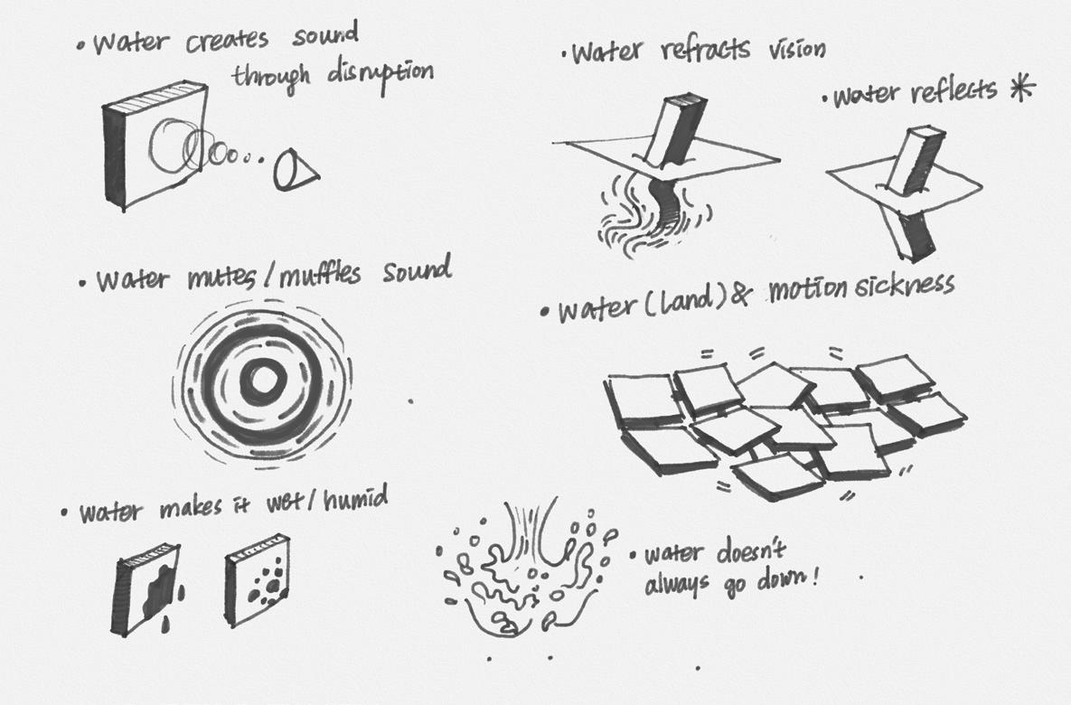 Her story touched on the broader meanings of water, revealing the diverse aspects of it. We realized that while water can be romantic and evoke positive images, it can also be dangerous, destructive, and distressing. Water has the power to create new life and heal us, but it can also swallow and wipe away everything in a moment. It connects different lands and creates new paths, but it can also be uncontrollable and unpredictable. Despite the perplexing attributes of water, we were not lost or overwhelmed by it. Instead, we wrote down and categorized our shared thoughts into several subtitles, reflecting on the memories and insights that water had sparked during the conversation. This process allowed us to not only explore the question “What is water?” but also allowed water to shape another imagery for us in response to our initial inquiry.