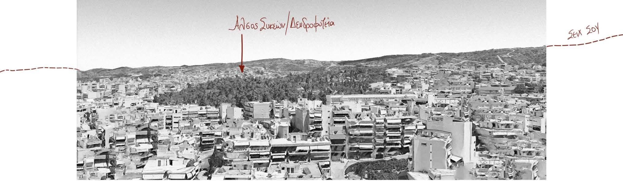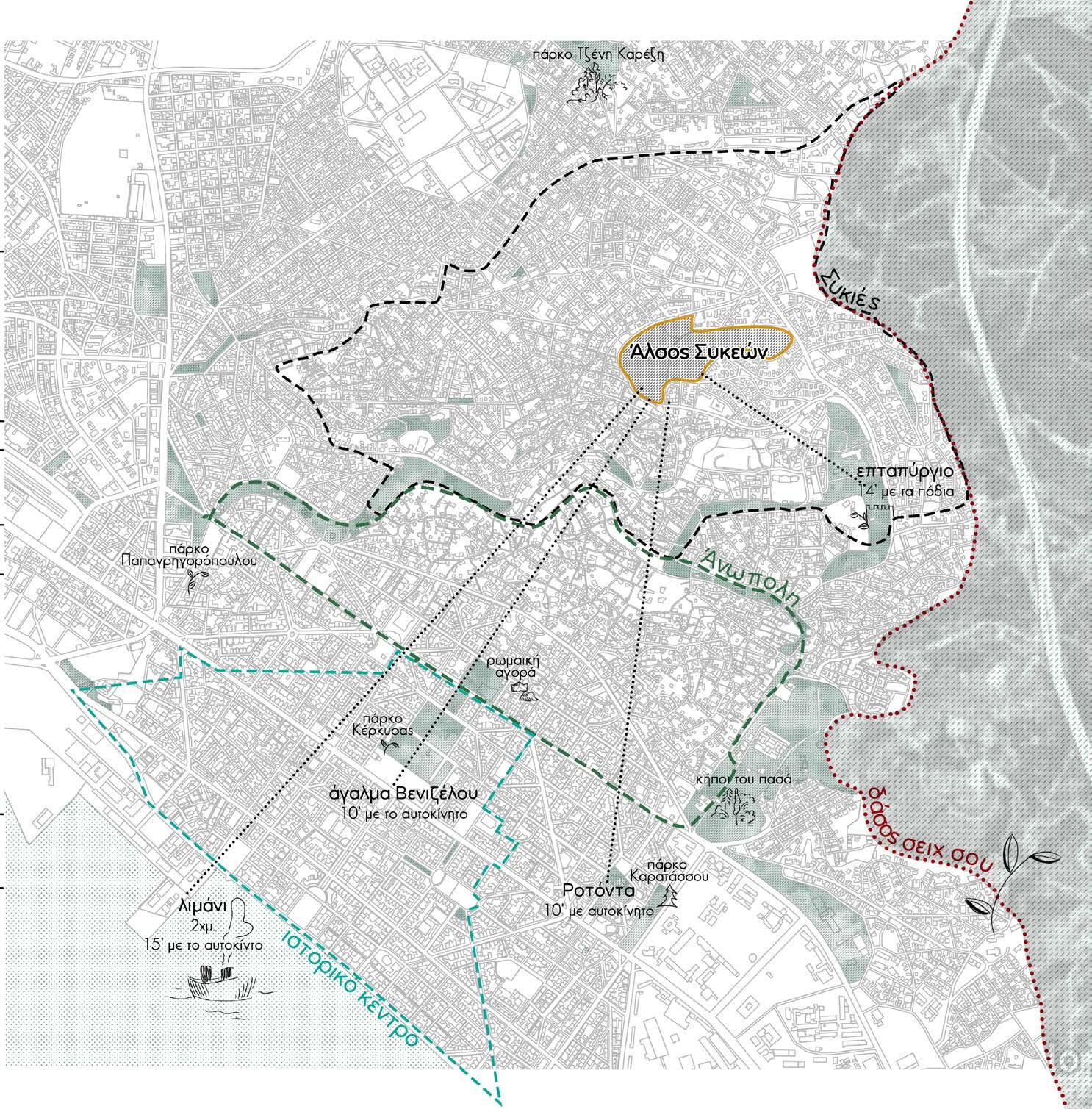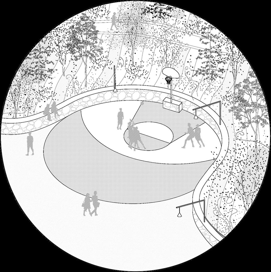 The park of interest, is a big park in Thessaloniki, in the neighborhood of Sykies. The specific neighborhood has been over many phases through the years, although, it always remains a very important crossroad between the city and the outer forest of Seix Sou. The main goal for our project is for the park to become a center of gatherings and everyday activities for the residents of the area, while at the same time it will be a friendly place for the animals of the forest that get down to the city. Throughtout small additions and workshops we propose that the inhabitants choose the main changes that the park needs. For us the basic element of our synthesis is for the nature to provide, while giving a chance for the neighborhood to grow and learn within. We propose a big change in the existing border of the park, with the creation of an active limit that hosts activities (ex. small courts, children games) and common spaces that are adaptable to everyday needs. At the same time we create points of information, about the wild life of the forest, the workshops taking place or the ones that are proposed etc. In the center left of the park we renovate the existing cafe, while we enrich the area with small warehouses, full of tools for the workshops, as well as gardening tools and seeds.