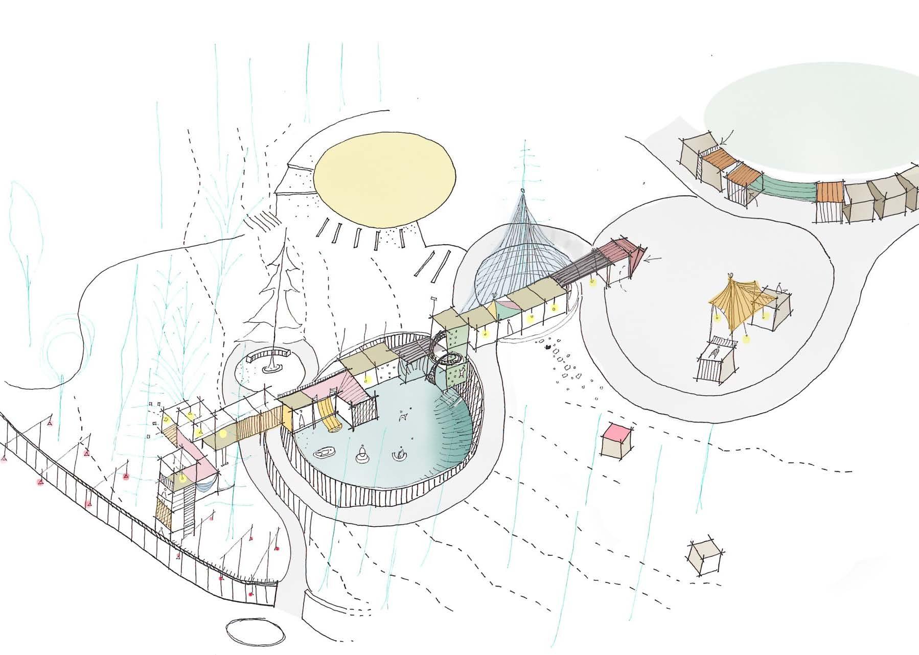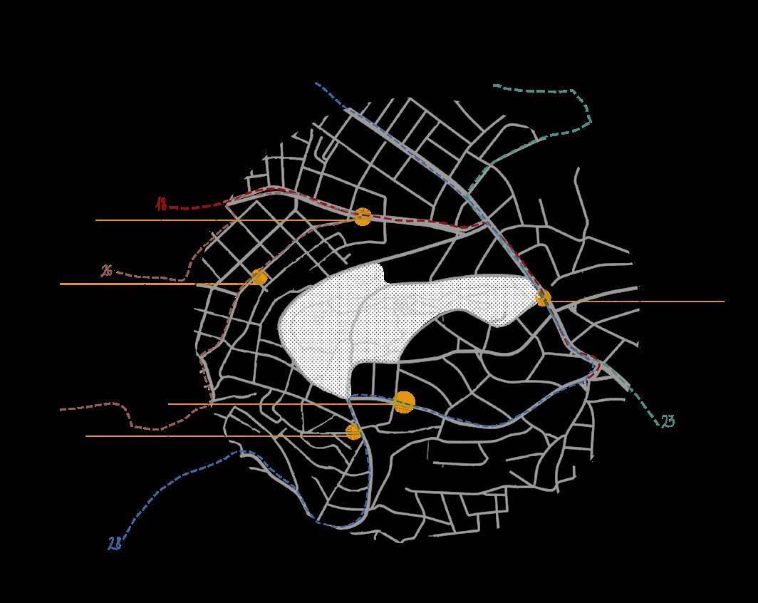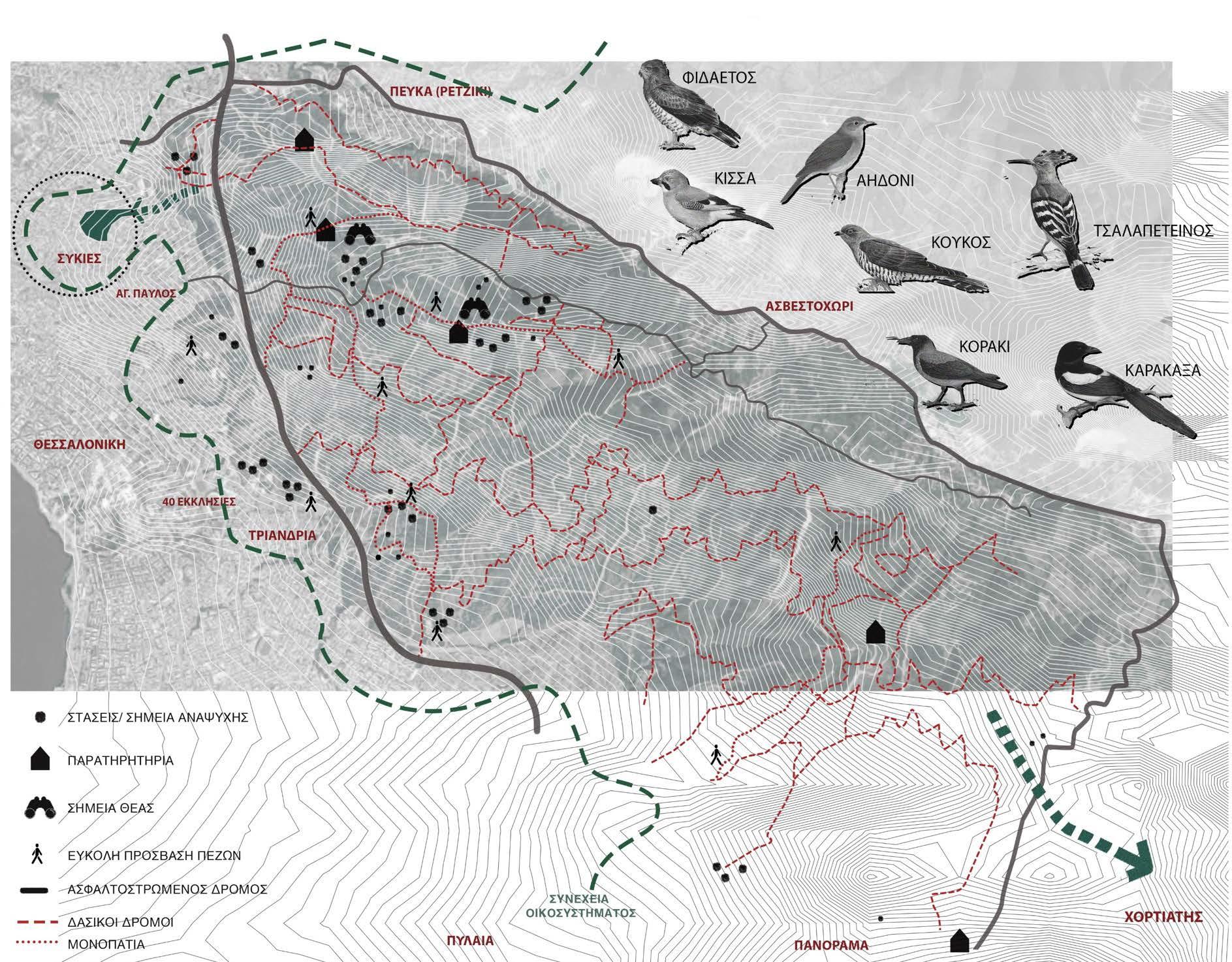 The park of interest, is a big park in Thessaloniki, in the neighborhood of Sykies. The specific neighborhood has been over many phases through the years, although, it always remains a very important crossroad between the city and the outer forest of Seix Sou. The main goal for our project is for the park to become a center of gatherings and everyday activities for the residents of the area, while at the same time it will be a friendly place for the animals of the forest that get down to the city. Throughtout small additions and workshops we propose that the inhabitants choose the main changes that the park needs. For us the basic element of our synthesis is for the nature to provide, while giving a chance for the neighborhood to grow and learn within. We propose a big change in the existing border of the park, with the creation of an active limit that hosts activities (ex. small courts, children games) and common spaces that are adaptable to everyday needs. At the same time we create points of information, about the wild life of the forest, the workshops taking place or the ones that are proposed etc. In the center left of the park we renovate the existing cafe, while we enrich the area with small warehouses, full of tools for the workshops, as well as gardening tools and seeds.