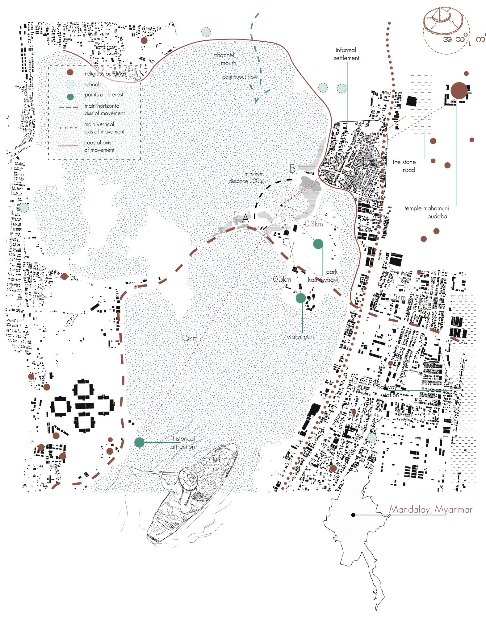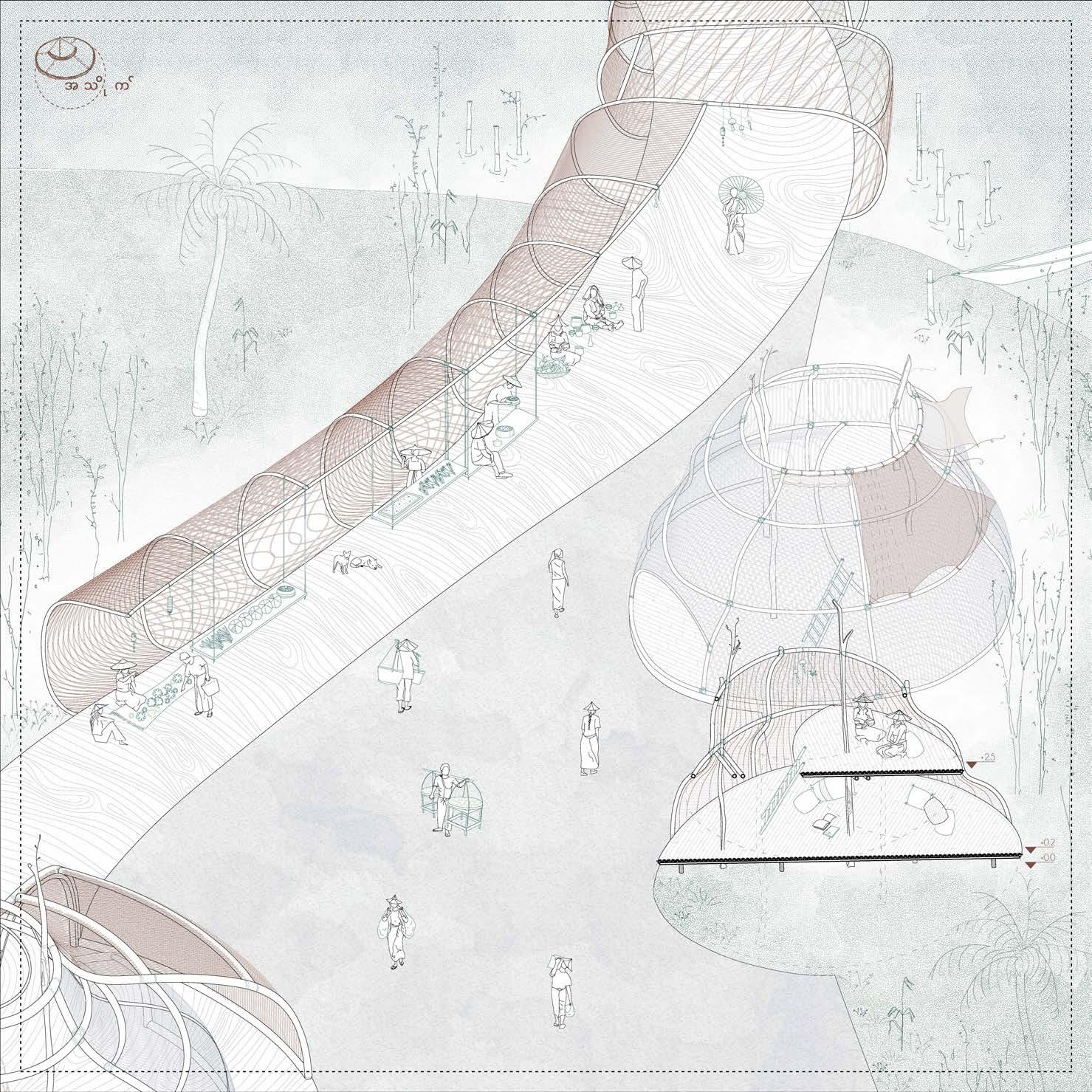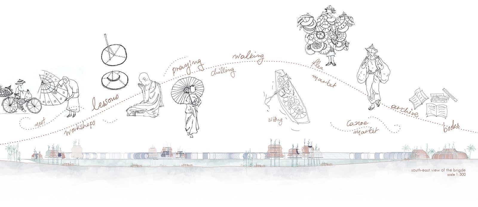 Our main idea is to design a bridge that -as the literal meaning of the bridge is to connect- connects metaphorically all the differences found in this country. The centre of our project has been the creation of a safe space. The bridge is found in Kantawgyia lake in Mandalay and it connects a small informal settlement with a park. As one approaches the bridge from the south-west side of the settlement, one can find the biggest construction which functions as an archive of lost books, texts etc. Entering the bridge one can come across some other smaller constructions that are used as safe spaces by passers-by. Someone can go and pray, just sit, read and relax. At the same time in some of this constructions one finds occasionally workshops related to traditional arts. Along the bridge one may encounter flea markets (regular and floating) containing traditional products and objects created in the workshops that take place on the bridge.