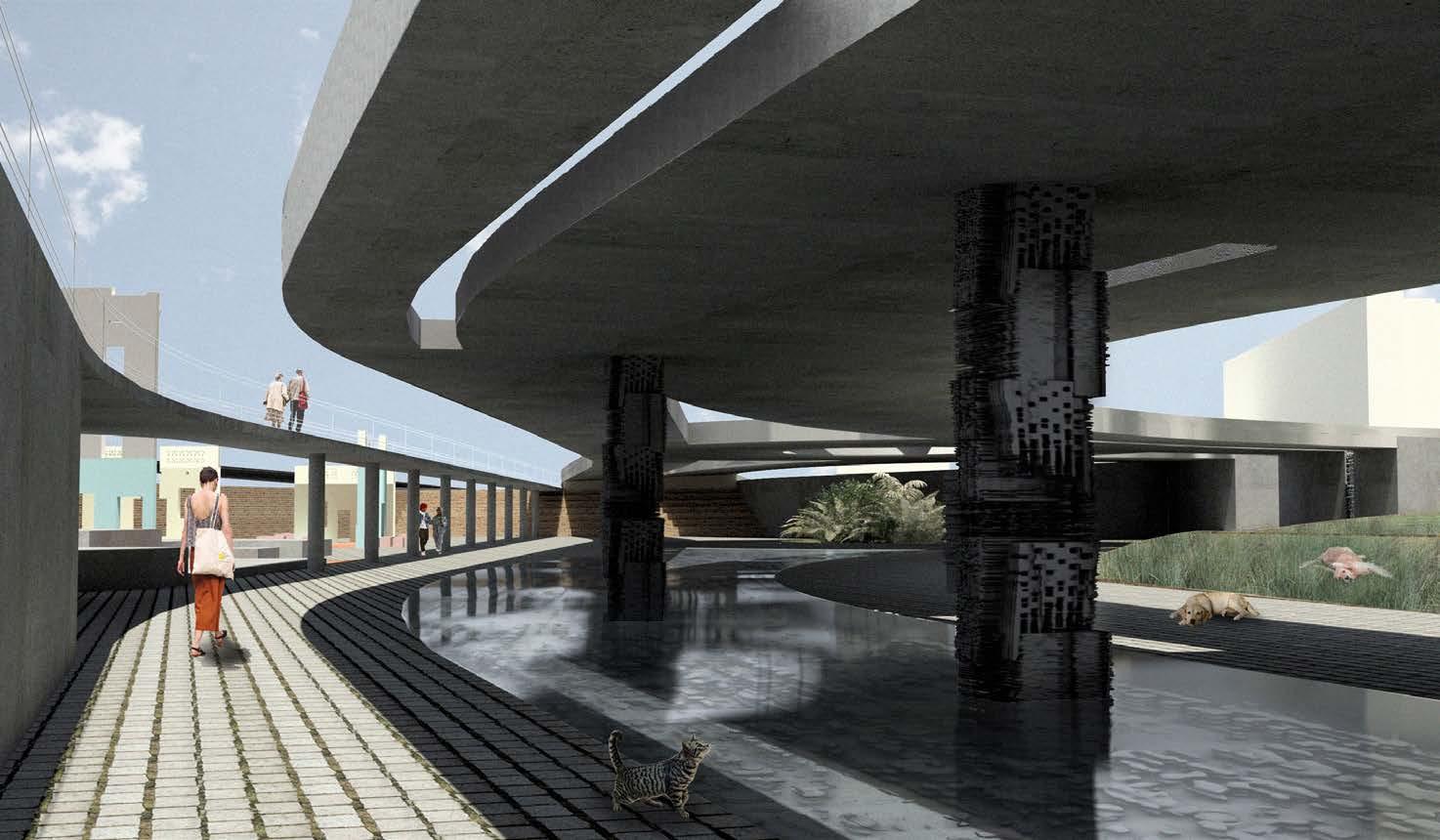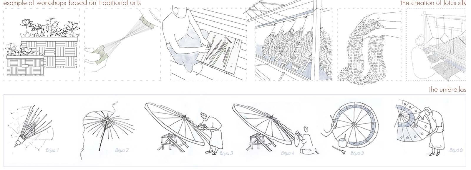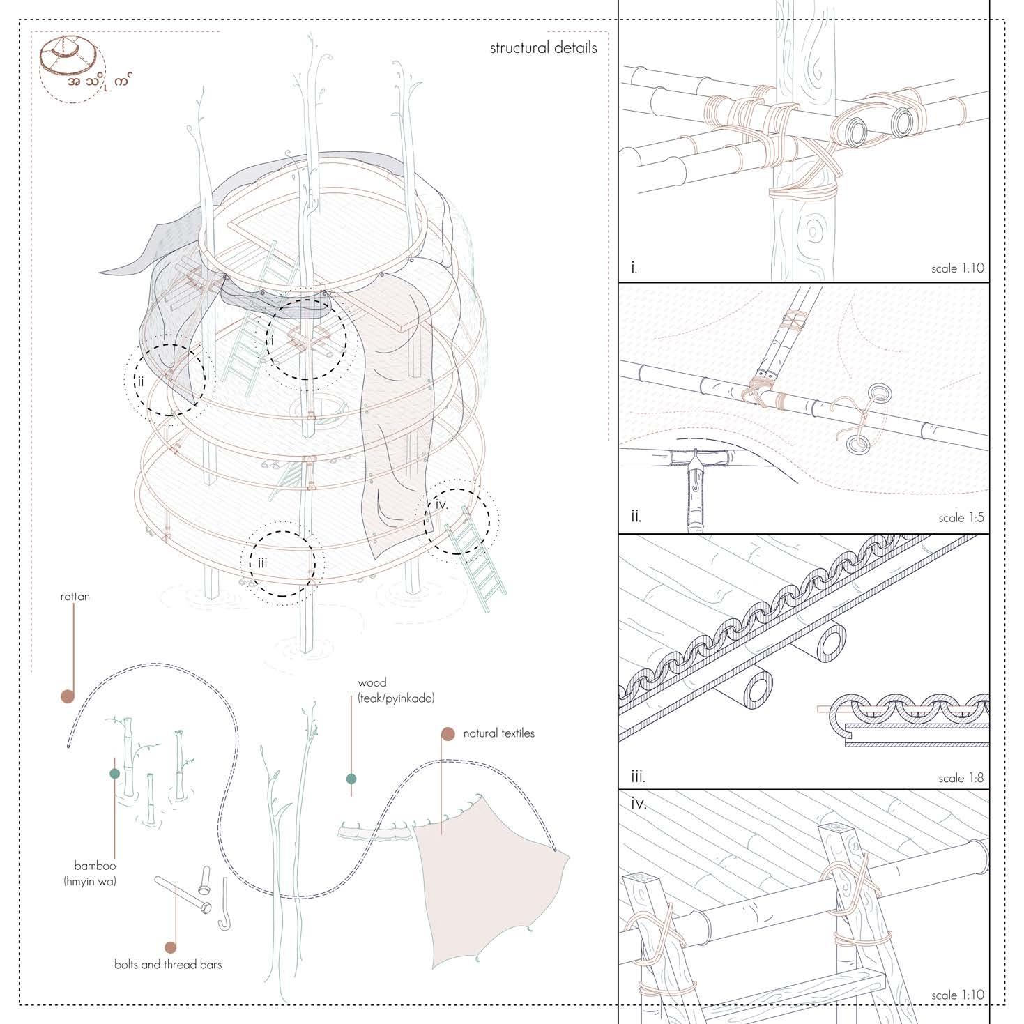 Our main idea is to design a bridge that -as the literal meaning of the bridge is to connect- connects metaphorically all the differences found in this country. The centre of our project has been the creation of a safe space. The bridge is found in Kantawgyia lake in Mandalay and it connects a small informal settlement with a park. As one approaches the bridge from the south-west side of the settlement, one can find the biggest construction which functions as an archive of lost books, texts etc. Entering the bridge one can come across some other smaller constructions that are used as safe spaces by passers-by. Someone can go and pray, just sit, read and relax. At the same time in some of this constructions one finds occasionally workshops related to traditional arts. Along the bridge one may encounter flea markets (regular and floating) containing traditional products and objects created in the workshops that take place on the bridge.