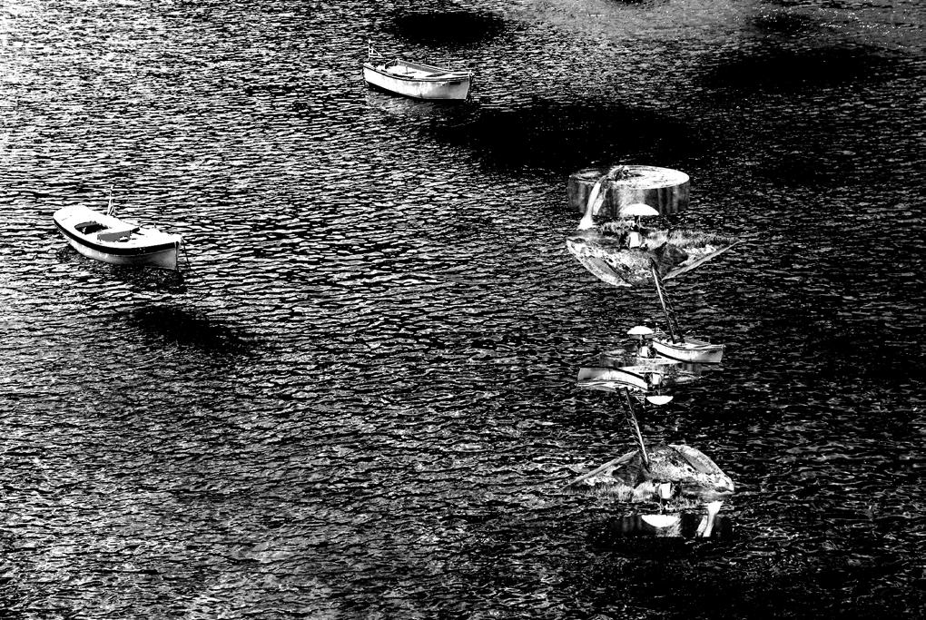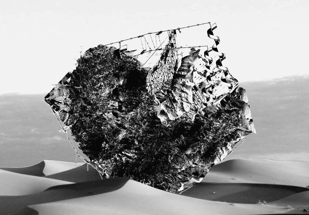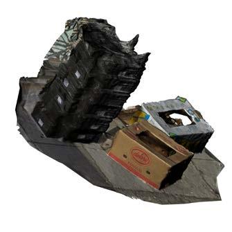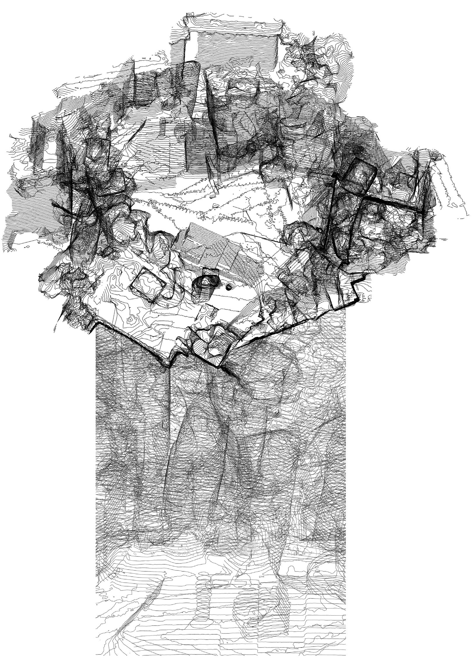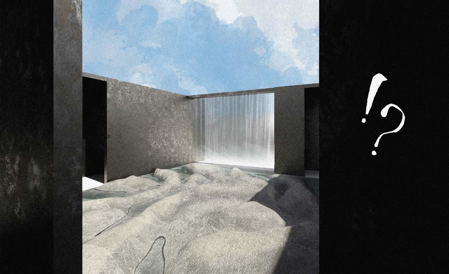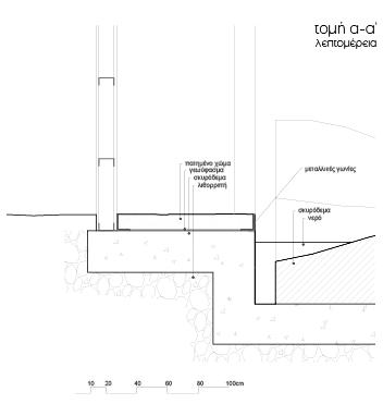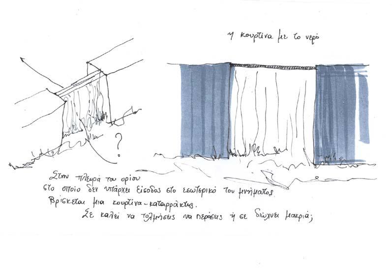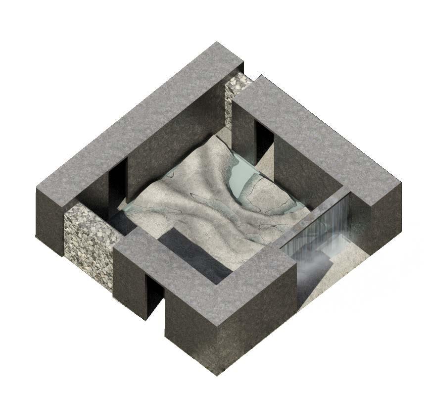 As a total sculpture, the tomb comes to negotiate the boundaries between place and nonplace, but also the qualities of the boundary itself. Externally one can encounter either a hard impermeable boundary (gabion), or a permeable but “negotiable” boundary (waterfall), or finally a metallic thin frame into which one can enter. Inside each metallic volume the visitor will encounter a narrow dark corridor, with an exit to the interior space of the composition. There is a relief surface with projections and dips, made of cast material, which is passable. The surface is enclosed by a frame of water which, because of the relief, can also roll inside. The tour inside the composition is “uncomfortable” thus creating a variety of internal feelings to the visitor.