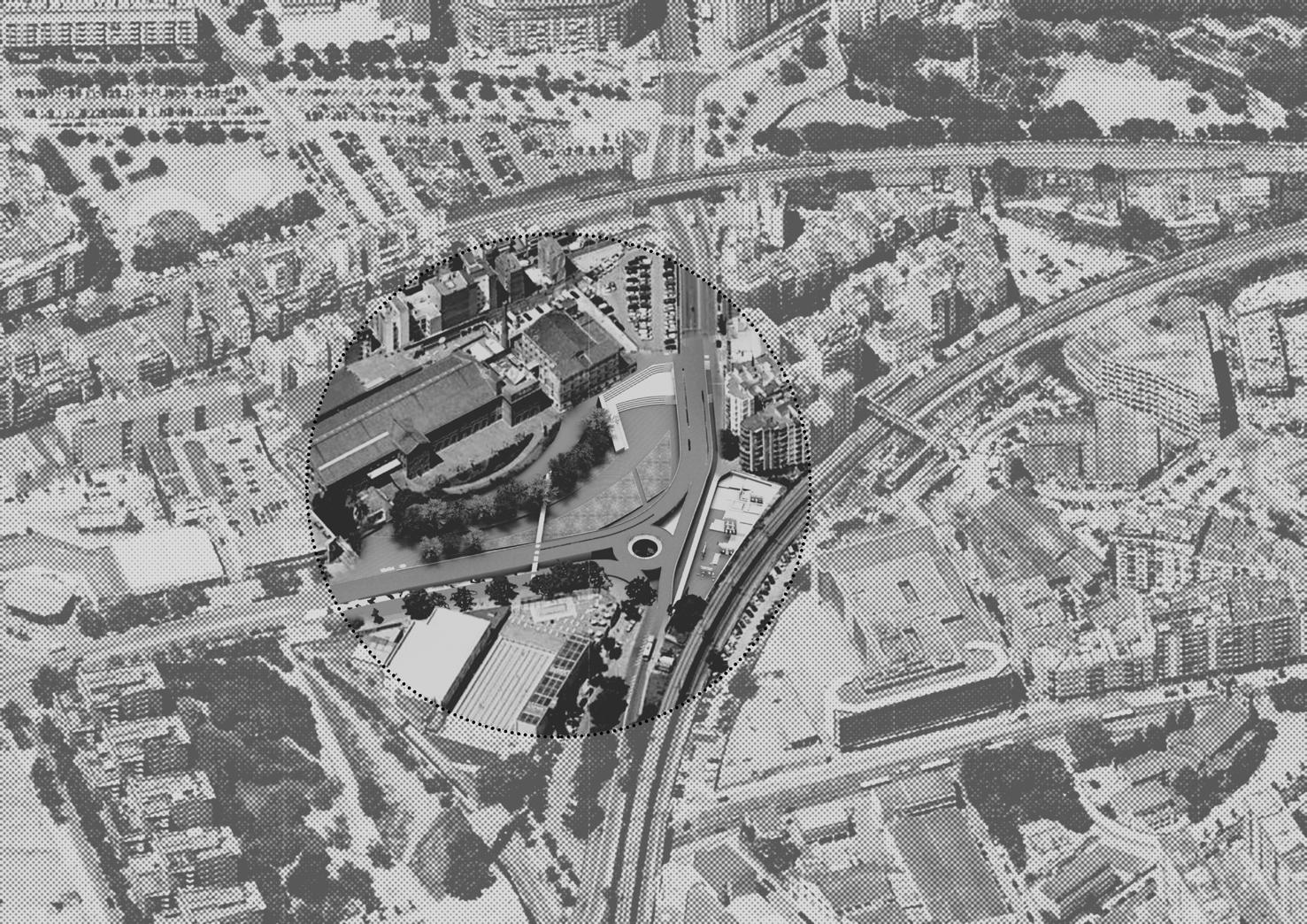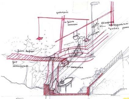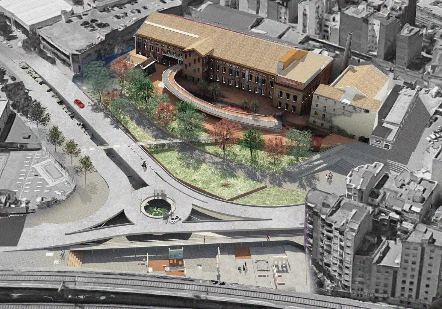 The main design principles were to facilitate pedestrian movement, both with routes and public spaces, and to highlight the Tecla Sala building itself. Thus, the street connecting the metro stop, Tecla Sala and the area of the old houses becomes a bridge, is reduced in width, while bike lanes are designed on it, resulting in freeing up the space underneath. An underground square is thus created which is gradually accessed either from south or north of the area or from the courtyard of Tecla Sala (whose lines are retained, but with the necessary slopes to meet the level of the underground space). From the area with the old houses, only their facades are preserved, which are repositioned differently on the site, creating micro-square spaces that function as staging areas, reminiscing of how traditionally people in a neighbourhood might have used the spaces outside their houses as a meeting and communication point. This particular area also becomes underground not by continuous slopes but by a gradual descent of the levels defined by the footprints of the old houses. The experiments are not used independently but come to adapt to the needs of the proposal and serve as boundaries, separations, supports or signs depending on the place where they are used.