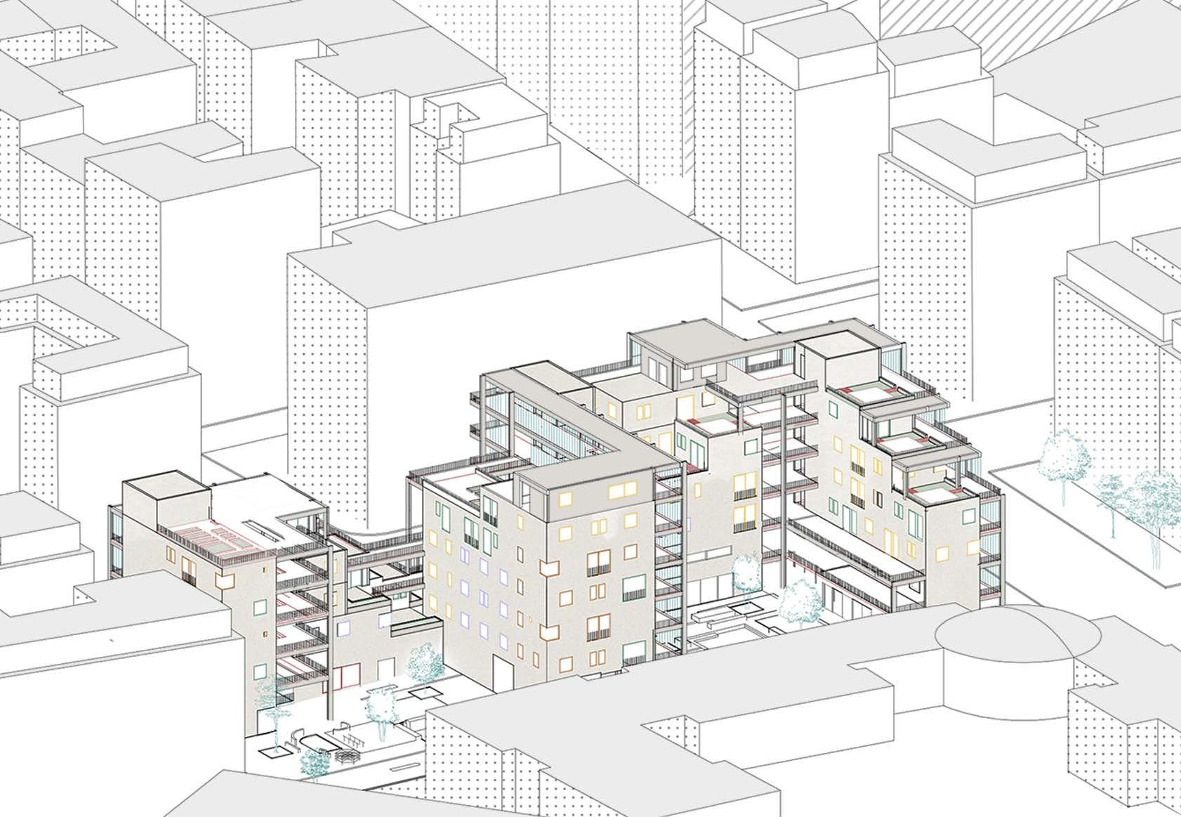 A mixed-use building in the center of Thessaloniki. The building consists primarily of housing units and secondary common spaces for upgrading the neighborhood, as well as office spaces. In the ground floor one can find a small cinema, a few cafes and a collective kitchen, but also the the central arcade hosts the market (retail market, as well as shops). On the side of the building that borders the central street of Tsimiski one can find on the ground floor, as well as the first floor the spaces that host the area of the offices. Αlong the length of the plot, a parking lot is structured in the underground space, which serves the residents of the building, leaving the ground floor space free for a multi-faceted urban design.