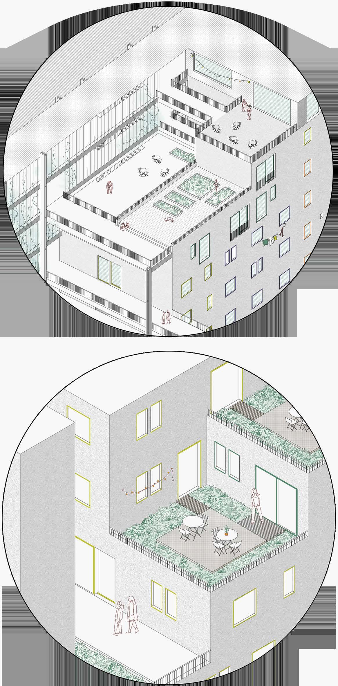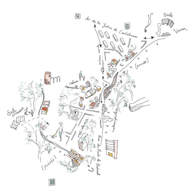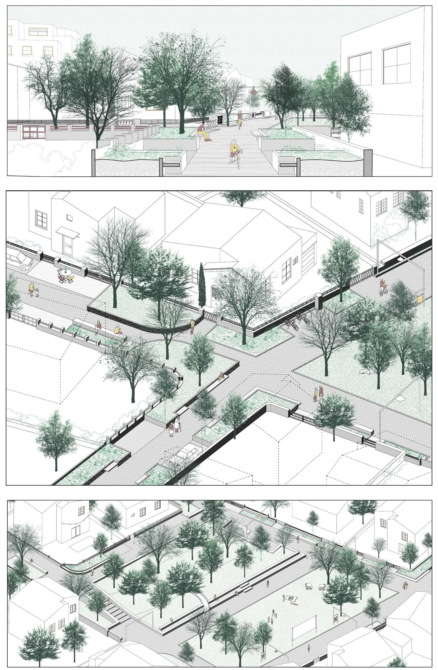 In a small urban area of Montpellier, we were expected to create a new friendlier and warmer atmosphere for the residents. My main goal was to embody the green element in every aspect of the design, as well as to create places that adapt to the everyday needs. I propose an open green space in the middle, ready to host activities of the neighbourhood, small rest stops, new bikestands and the creation of woonerfs all around the habitable area of the small neighbourhood.