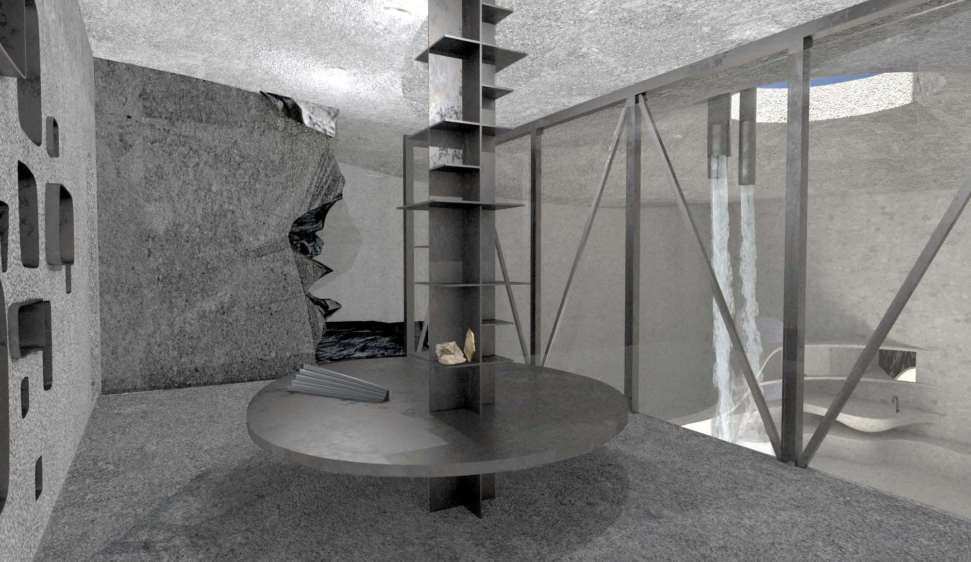 The bathroom and the work area are combined in a single composition, with a cavernous atmosphere. The bathroom develops organically like a sculpture, with the bathtub at the centre of the composition, creating a spiral movement around it. The work space, on the other hand, displays orthogonal characteristics, and as a metal structure, is embedded in the rock that delimits one side of the room. As it is at a higher level than the bath space, it functions as a point of observation of the sculpture, which alludes to Smithson’s video recordings and observations of his works from above.