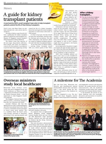 free of dialysis, you will have greater independence to do the things you have always wanted to do,” the authors said in the book’s introduction. “However, a kidney transplant can only be successful if you take good care of yourself.” Information and tips include preparation for the procedure, what the procedure involves, what to expect before and after surgery, the risks and benefits of an organ taken from a living versus deceased donor; taking care of the surgical wound, clinic consultations, possible complications, the medication to be taken after a transplant, diet and hygiene; as well as how a patient might show his gratitude to the family of the kidney donor. Just as importantly, the patient is taught to recognise the signs of organ rejection as he is never free from this possibility, and it is important that he knows what to do if he has symptoms or signs of rejection. SGH’s renal transplant patients are given a free copy. It is also available for sale at $17 a copy, with the proceeds going to TRUEfund – a fund managed by SingHealth Foundation for needy transplant patients. Copies of the book are also available for reading at SGH’s Patient Education Resource, Peritoneal Dialysis Centre and T Clinic. It is published in English, Chinese and Malay. For more information about My LifeBook, call 6326-5195 or send an email to singhealth.transplant@singhealth.com.sg.