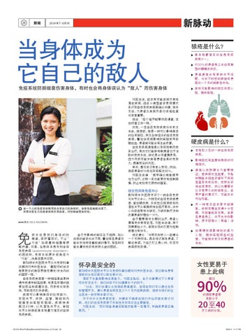 综合性自体免疫中心 新加坡中央医院开设了一间自体免疫 与关节炎中心,为特定的自体免疫病患 者,诸如硬皮病、系统性红斑狼疮和风 湿性关节炎等提供综合医疗服务。该中 心也促进教学与研究,为研发新疗法和 改善患者护理出一分力。 由于需要接受长期的治疗,患者心 情难免会表现低落。刘医生说道,除了 定期复检之外,保持乐观的态度对控制 病情也有好处。 她还建议: “与朋友和家人一起建立 一个支持网络。再去结识其他患者,了 解该疾病,为自己打上强心针,无须对 疾病感到恐惧。”