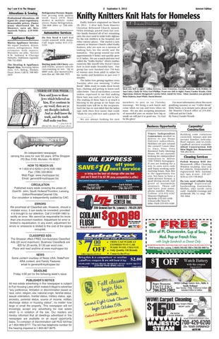 An independent newspaper serving this area for over 50 years. ©The Shopper PO Box 3100, Munster, IN 46321 –––––––––––––––––––– HOW TO REACH US ☎ 1-800-410-5250 • (219) 836-1960 Fax: (708) 333-9630 Web Page: www.myshopper.biz Email: general@myshopper.biz –––––––––––––––––––– CIRCULATION Published every week covering the areas of: Dyer/St. John, South Holland/Thornton, Lansing, Dolton/Riverdale/Calumet City. Our circulation is independently audited by CAC –––––––––––––––––––– ERRORS We proofread all Classified ads. However, should a mistake occur, it can easily be corrected, provided it is brought to our attention. Call 219-836-1960 to rectify an error. We cannot be responsible for more than one incorrect insertion. Adjustment for error is limited to republication. In any event, adjustment for errors or omissions is limited to the cost of the space occupied. –––––––––––––––––––– CLASSIFIED ADS The Shopper offers FREE non-business Classified Ads (20 word maximum). Business Classifieds are $20 for 20 words, $1.00 per word over. Place and read anytime at www.myshopper.biz –––––––––––––––––––– NEWS Some content courtesy of News USA, StatePoint ARA content, and Family Features. email to general@myshopper.biz –––––––––––––––––––– DEADLINE Friday 4:00 pm for the following week’s issue. –––––––––––––––––––– PUBLISHER’S NOTICE All real estate advertising in this newspaper is subject to Fair Housing Laws which makes it illegal to advertise “any preference, limitation or discrimination based on race, color, religion, sex, national origin, familial status, sexual orientation, marital status, military status, age, ancestry, parental status, source of income, military discharge status or housing status”; no matter how large or small the property. This newspaper will not knowingly accept any advertising for real estate which is in violation of the law. Our readers are hereby informed that all dwellings advertised in this newspaper are available on an equal opportunity basis. To complain of discrimination call HUD toll-free at 1-800-669-9777. The toll-free telephone number for the hearing impaired is 1-800-927-9275.