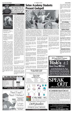 A/C & Heating Appliance & A/C Repair. Furnace & Boiler Repair and In s t a l l a t i o n , E l e c t r i c & Plumbing. Insured & bonded. All work guaranteed. Call Christopher 312-835-4865 Please join Seton Academy students as they present Godspell Friday, November 2 and Saturday, November 3 at 7:30 pm. Tickets for the performance are $5 for adults, $3 for students and seniors and $1 for children 12 and under. Pictured in the photo are Michael Carten (center) clockwise, Darius Brown, Fisher Price infant bathrub, Fisher Price bouncer, Evenflo exersaucer, Graco infant swing, First years potty chair, new in box. 708-841-7106 Graco Winnie the Pooh, Infant carseat with base, kolcraft bouble stroller. 708841-7106 CTA and Pace transit cards. 708-841-7106 Leaded crystal chandelier little tikes Clifford the Big Red dog sand box. 708-8417106 Sears roaser over whtie with removale cookwell adustable temp control, $15; canning jars quarts glass only $3 doz. 708-333-9520 Kenmore d-humdifier $20; 3 boxes of bar glasses & glass pitchers each box $5; complete set of Liberty Falls collection entire set $5. 708601-5269 For sale 24 ft. aluminum ext. ladder $40. Call Dan. 773226-2502 For sale: 2 sports coats; grey one blue, never worn $20 each. Call Dan. 773-226-2502