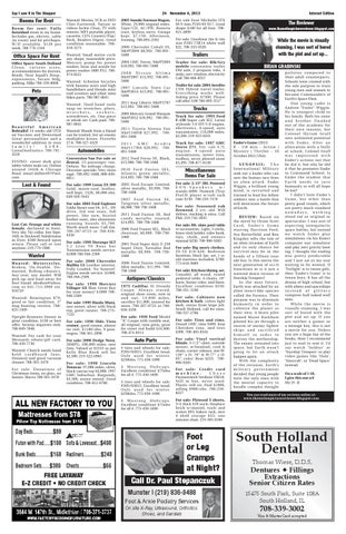 Bedroom furniture triple For sale: Big men’s clothes, dresser 70” long, Bedroom matching 2X-5X $10-$20; mirror chest furniture, black(Armoire) 3pc. set, 138” yr. wide pecan immaculate clean old mattress included, $700. traditional wood from. Bay 773-610-9689 Furniture $250. 708-862-0970 For sale: Kitchen/dining set. Like new Whirlpool Canadel, all wood,window round air conditioner, 26” wide, 18” 22” pedestal table, 4-chairs, long. 8000 BTU 1 leave, honey color,can andcool linen. level in home $125 obo.$350. 708Excellent condition 285-1815 708-351-3196 Men’s WilsonCabinets golf clubs, irons, For sale: new putter woods, bagcolors shoes,light rain kitchen & bath, gear; grill 22 inches dark, weber extras from large job. round, $50. 708-849-6273 South Holland, call for sizes. 708-557-2706 Hosta plants, $100; plant flox 50 plant. 708-474-2541 Foreach sale: Tires and rims. Denali GMC rims $400; Jeep Rhino 24” mountain biketires $45; Cherokee rims, and Magna 26” mountain bike, $300. 708-465-8544 $52. 708-333-7432 For sale: V inyl ver tical Baseball gloves and bats. blinds: 3-1/2”-slate, outside Rawlings, Easton, Wilson kids mount, w/headrail, cord & gloves or bats, $5 ea. size Adults chain, corner valance, W: gloves, bats, ea. x708130” x $25; H: 70” & $10 W:77” H: 333-7432 65”, color: Rose $225. 708906-9265 Sauder computer desk with desk Fo r chair, s a l e medium : C r e d ioak t ccolor ard shelf, m a c little h i n cabinet e. Ccan h atext se picture, $50 Verifone firm forVX610. both. Paymenttech 708-263-7956 Still in box, never used. Plastic still on. Paid $1000, selling $900/obo. 708-2508227 For sale: Plywood 5 sheets,