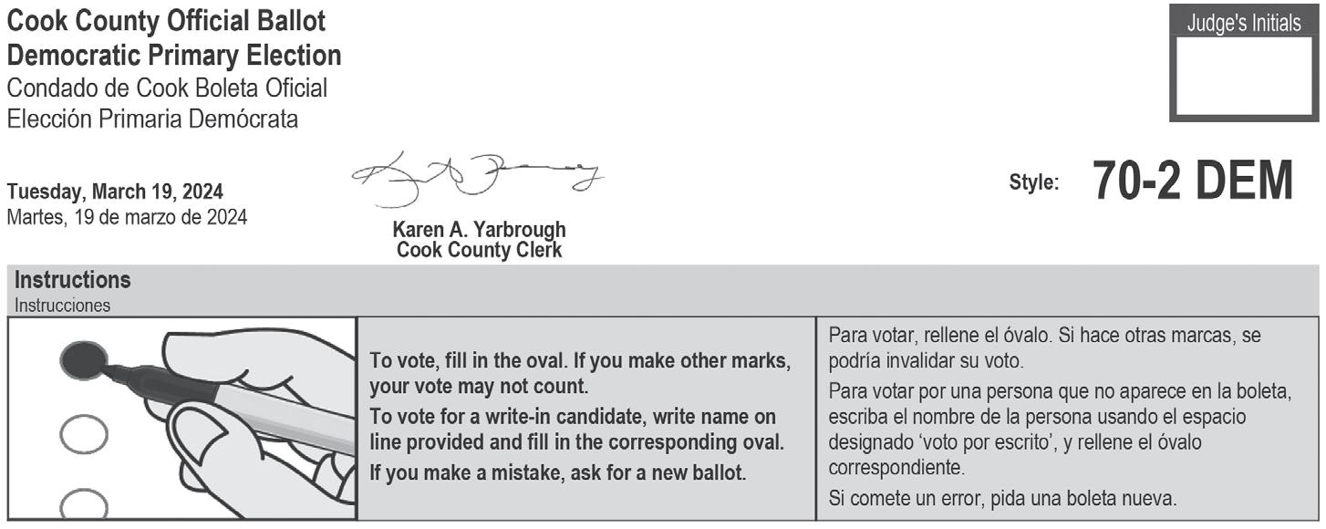 La eleccion primaria tomara acabo en precintos de eleccion bajo la jurisdicción de la división de eleccion del Cook County Clerk's Office.