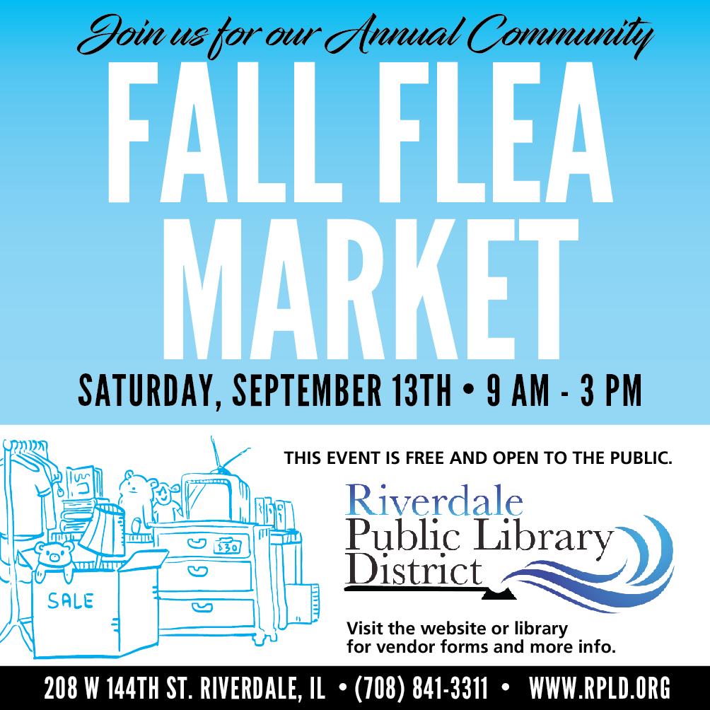 Join us for our annual community fall flea market. This event is free and open to the public. For more info or to reserve vendor space(s), registration forms are available on our website or at the library. We look forward to seeing you there! ONGOING PROGRAMS