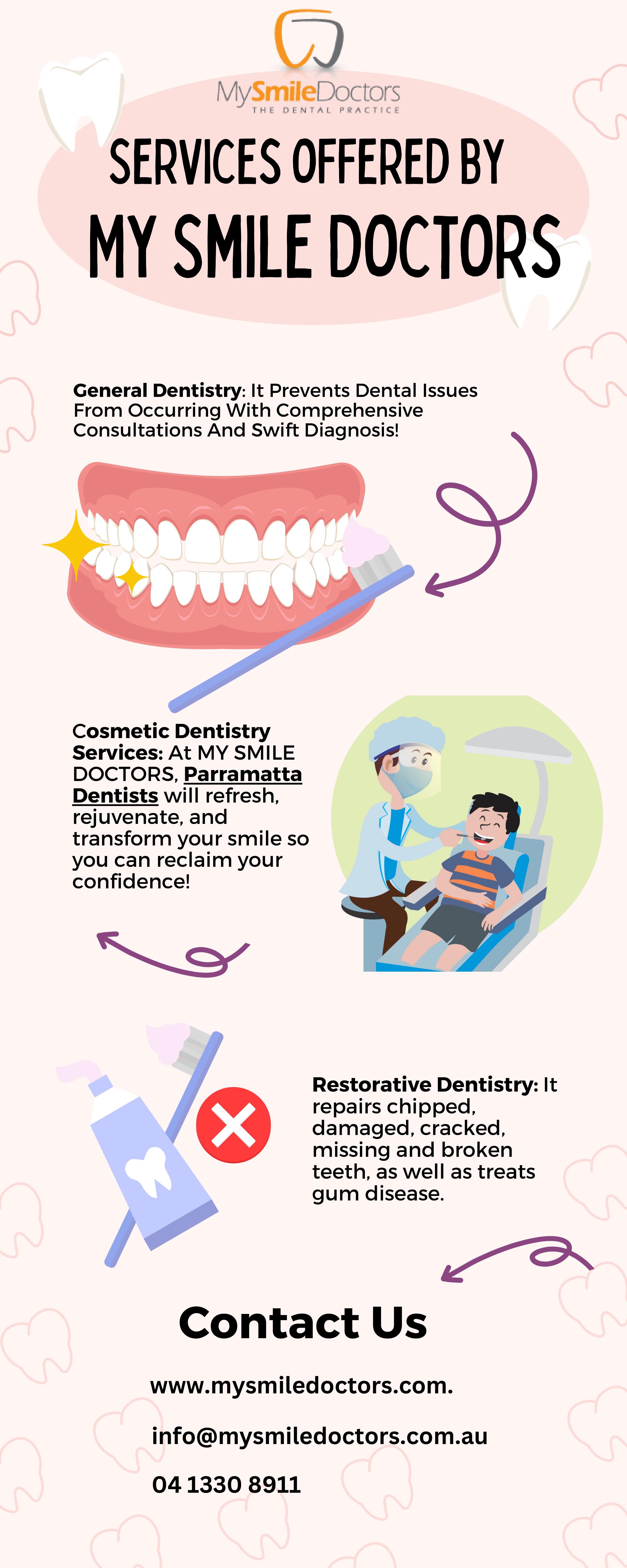 Do you have any dental issues? However, finding the ideal dentist who can fix all of your problems in one visit. Then here's how to solve that problem. My Smile Doctors provide a wide range of dental treatments, including general dentistry, cosmetic dentistry, restorative dentistry, root canal therapy, wisdom teeth removal, gum disease treatment, and more. Our proficient dentist in Parramatta will assist you in any situation. Visit us at https://www.mysmiledoctors.com.au/