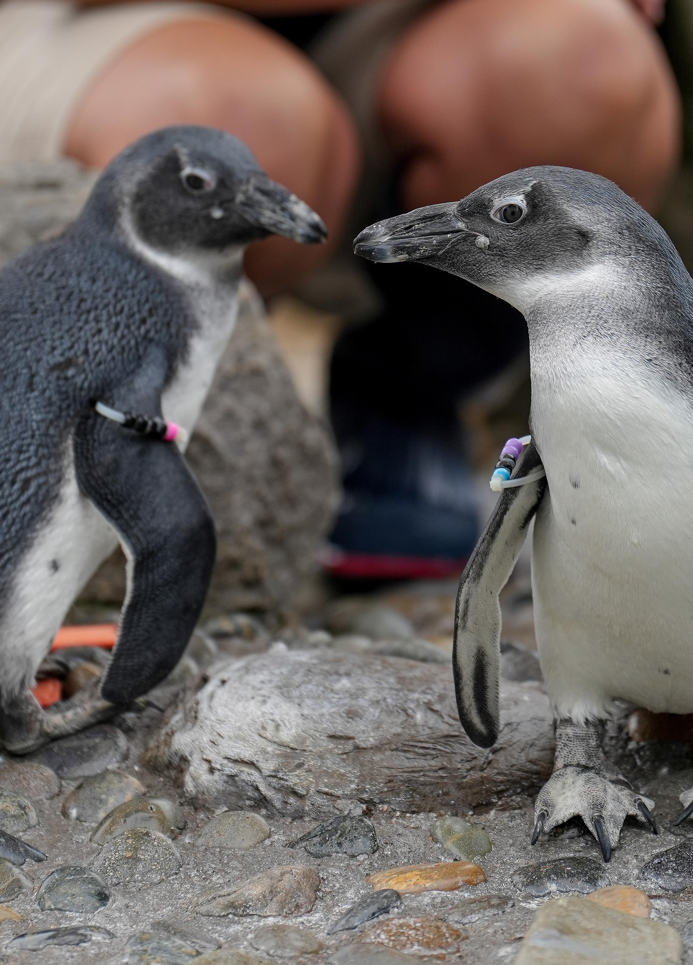 Rather than traditional names, Mystic Aquarium uses a color-coding system to identify each penguin. The 2024 additions are Black/ Purple and Black/Black. When you visit Mystic Aquarium’s penguin habitat, look for the colored beads on their flippers.