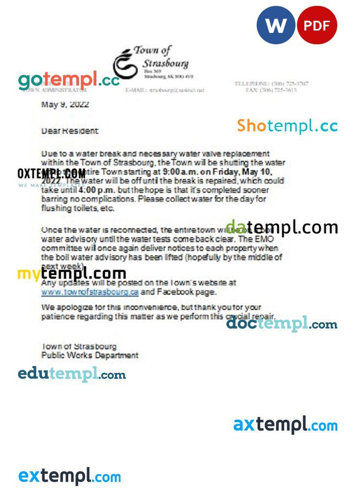 Completely editable Canada Saskatchewan Town of Strasbourg water utility shut off notice, .doc and .pdf template is of high quality.