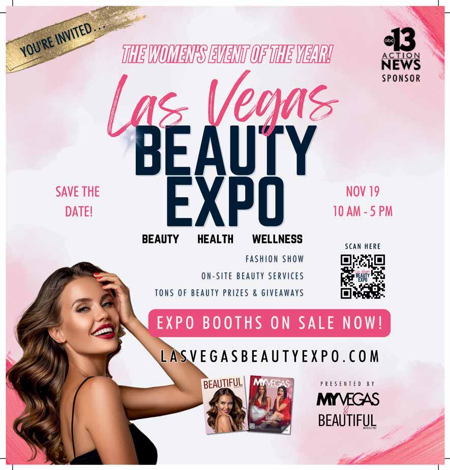 We are ecstatic to announce a brandnew event coming to the beauty industry this fall… The Las Vegas Beauty Expo! Brought to you by MyVegas Magazine & Beautiful Magazine. As seen in our inside front cover, this expo will encompass all things health, wellness, and beauty and is set to be the women’s event of the year! Expo Booths are on sale now!! And free general admission tickets are available now! More information: www.LasVegasBeautyExpo.com