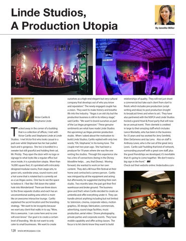 ourselves as a high-end elegant but very cultural company that develops out of who you know and reputation.” The newly engaged couple has a vision. They want to make history and breathe life into the industry. “Vegas is an old city but the production business is still in its infancy stage,” said Carillo. “We want to brand ourselves as part of the Las Vegas progression.” These genuine sentiments are what have made Linde Studios the upcoming Las Vegas premier production studio. When I asked about the motivation to build Linde Studios, Carillo replied with only two words, “Oh, Stephanie,” in his loving tone. The couple met two years ago. She had been a producer for 19 years where she was the one renting the studios. Through this experience she has a line of connections (being in the Disney bloodline helps… yes, that Disney). Moving forward, she wanted to work on her own content. They did a 48-hour film festival at their home and contracted a camera person. Carillo was intrigued by all the equipment and acting but afterwards, he suggested starting their own studio. Two months later, the pair got their first warehouse and broke ground. The business grew and that’s when Carillo decided to create an umbrella and offer everything under it. They can handle almost anything including but not limited to: television, cinema, corporate videos, motion graphics, 3D design, fabrication, commercials, advertising, sound stage facilities, music production, aerial video / Drone photography, private parties and corporate events. They have mobile capability and offer acting classes. The focus is to let clients know they want to build