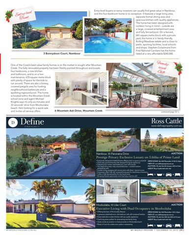 One of the Coast’s best value family homes is on the market in sought-after Mountain Creek. The fully renovated property has been freshly painted throughout and boasts four bedrooms, a new kitchen and bathroom, and is on a lowmaintenance, 670-square metre block with plenty of space for the kids to run around. There are also a breezy, covered pergola area for hosting neighbourhood barbecues and a sparkling inground pool. The home is located within the Mountain Creek school zone and agent Michael Knights says it’s only six minutes and 32 seconds’ drive from Mooloolaba beach. He’s looking for a quick sale 6 Mountain Ash Drive, Mountain Creek and invites all serious offers.