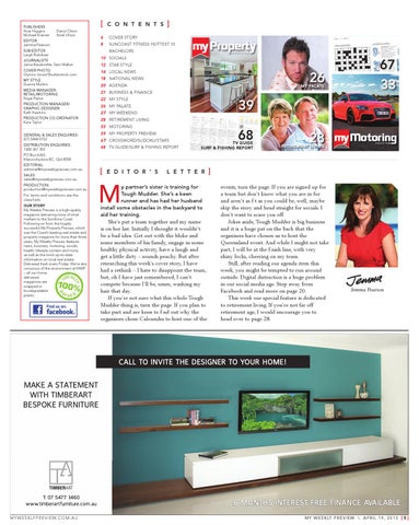 ] events, turn the page. If you are signed up for a team but don’t know what you are in for and aren’t as f t as you could be, well, maybe skip the story and head straight for socials. I don’t want to scare you off. Jokes aside, Tough Mudder is big business and it is a huge pat on the back that the organisers have chosen us to host the Queensland event. And while I might not take part, I will be at the f nish line, with very shiny locks, cheering on my team. Still, after reading our agenda item this week, you might be tempted to run around outside. Digital distraction is a huge problem in our social media age. Step away from Facebook and read more on page 20. This week our special feature is dedicated to retirement living. If you’re not far off retirement age, I would encourage you to head over to page 28.