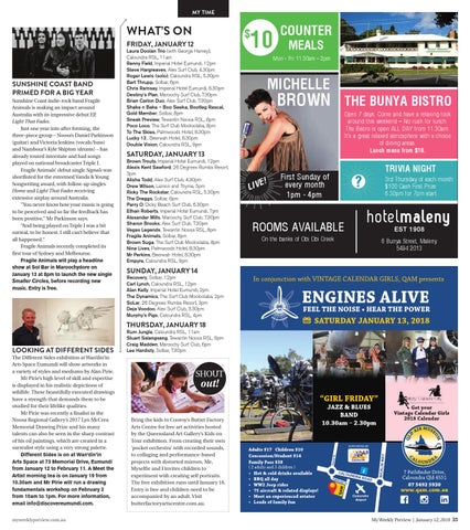 SATURDAY, JANUARY 13 Brown Trouts, Imperial Hotel Eumundi, 12pm Alexis Kent Sawford, 26 Degrees Rumba Resort, 3pm Alisha Todd, Alex Surf Club, 4.30pm Drew Wilson, Lemon and Thyme, 5pm Ricky The Rockstar, Caloundra RSL, 5.30pm The Dreggs, Solbar, 6pm Perry O, Dicky Beach Surf Club, 6.30pm Ethan Roberts, Imperial Hotel Eumundi, 7pm Alexander Mills, Maroochy Surf Club, 7.30pm Sharon Brooks, Alex Surf Club, 7.30pm Vegas Legends, Tewantin Noosa RSL, 8pm Fragile Animals, Solbar, 8pm Brown Suga, The Surf Club Mooloolaba, 8pm Nine Lives, Palmwoods Hotel, 8.30pm Mr Perkins, Beerwah Hotel, 8.30pm Empyre, Caloundra RSL, 9pm