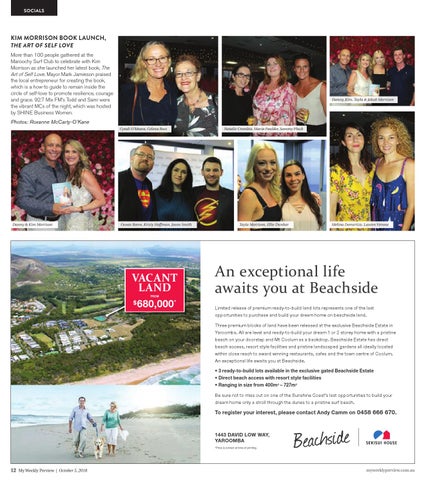 KIM MORRISON BOOK LAUNCH, THE ART OF SELF LOVE More than 100 people gathered at the Maroochy Surf Club to celebrate with Kim Morrison as she launched her latest book, The Art of Self Love. Mayor Mark Jamieson praised the local entrepreneur for creating the book, which is a how-to guide to remain inside the circle of self-love to promote resilience, courage and grace. 92.7 Mix FM’s Todd and Sami were the vibrant MCs of the night, which was hosted by SHINE Business Women.