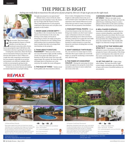 THE PRICE IS RIGHT Styling can really help to maximise the sale price of your property. Here are 10 tips to get you on the right track. through your property at an open home? Belinda Litster, owner of Chez B, styles homes across the Sunshine Coast. She shares her top 10 tips with My Property Preview. These small adjustments to your property could lead to big returns once you place your property on the market.