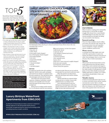 • For winter get out the slow cooker, crock pot or heavy casserole dish. It’s easy to create simple one-pot dishes that are full of flavour and that you do not need to fuss over. • Winter is the best time of year to use the cheaper cuts of meat. Long, slow cooking helps to break down the tough fibres and sinews resulting in rich, soft-textured full-flavoured meat. • Add cinnamon, cloves and star anise to your stews and casseroles. They have beautiful warming winter aromas and turn a simple everyday dish into something exotic. • Stock up on pulses and grains. Dried beans, lentils and quinoa are hearty, filling substitutes for our normal carbs. All of these take on great flavour and are filling and warming. • Don’t forget your vegetables – cauliflower, broccoli, brussels sprouts, carrots and parsnips are in peak season and sweeter in the colder months. Cut up these vegetables, toss in olive oil, salt, pepper, thyme and garlic. Roast in the oven or barbecue. Do you have a favourite winter recipe? Send it in along with a quality photograph and we will print some of the best in our My Time pages throughout winter. Email: cholznagel@myweeklypreview.com.au PLUS, for those who enjoy dining out, we have sourced some winter favourites on offer at venues across the Coast. See page 31.
