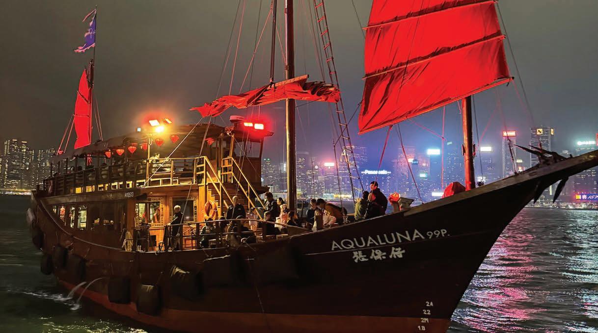 One of the best ways to experience Hong Kong’s charm at night is aboard a traditional junk boat, cruising along Victoria Harbour, as the city’s Symphony of Lights illuminated the skyline in a spectacular show. The skyscrapers transformed into a synchronised dance of colours and music. The glowing lights reflected off the water, creating a truly magical evening.
