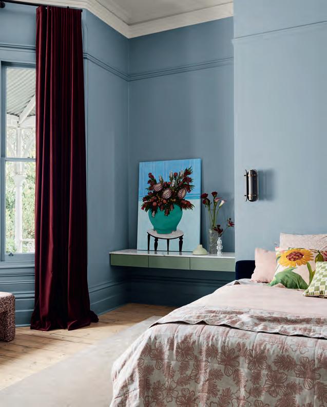 In the master bedroom, Bree added depth through the use of greyed-off blue and layers of mid-tone shades, including Dulux’s Antique White USA.