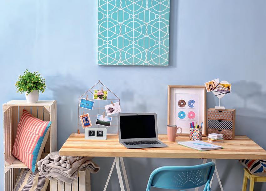 Let your personality shine with design touches that inspire creativity. Choose a colour palette that promotes calmness and focus, such as soothing blues or earthy neutrals. Display motivational quotes, family photos, artwork you love and plants to bring a touch of greenery.
